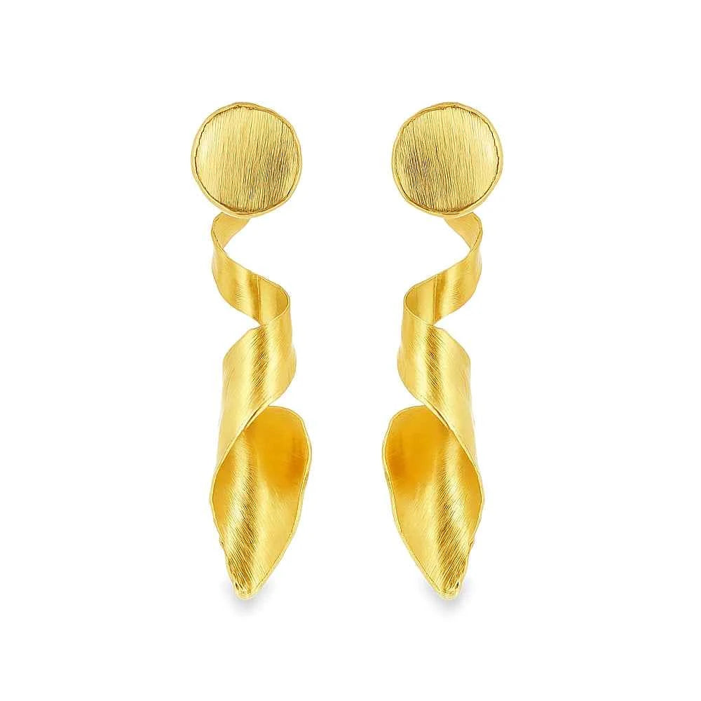 Елегантни дълги италиански сребърни обеци с прецизна позлата, ръчно оформена спираловидна форма и модерна матирана текстура. Впечатляващ дизайн, който съчетава елегантност и динамика. Закопчаването е на щифт.