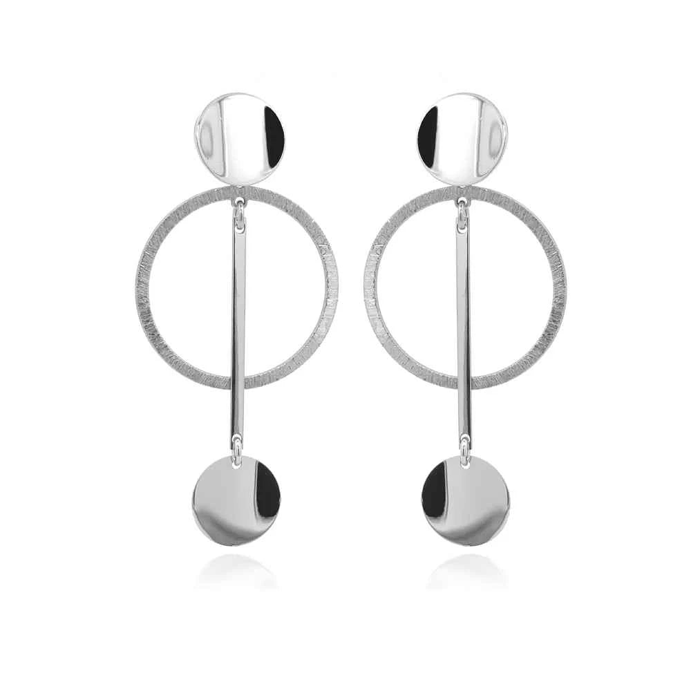 Тези обеци съчетават форма и движение в една елегантна композиция. Кръг, линия и точка – всеки елемент има роля в тази сребърна игра на симетрия и светлина. Контрастът между матовия кръг и огледалните повърхности придава изтънченост, докато лекото им движение създава усещане за живот. Идеални за онези, които обичат изчистени, но запомнящи се бижута. Изработени от стерлингово сребро с родиево покритие за блясък и устойчивост.
