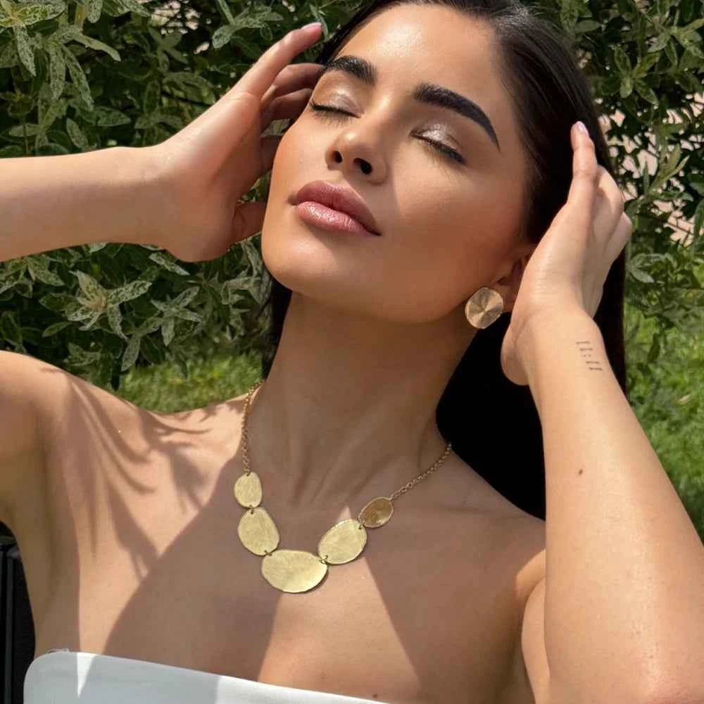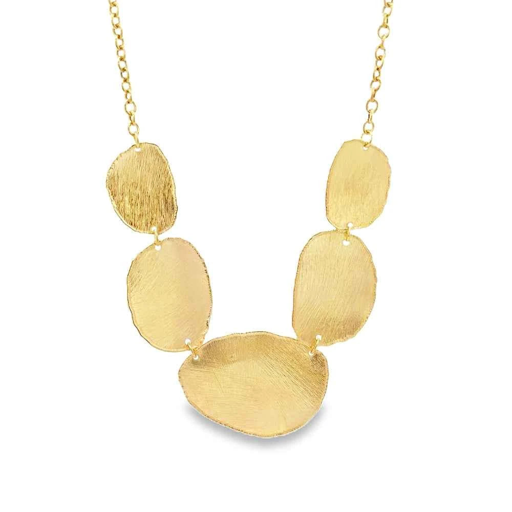 Golden Origins е колие, което разказва историята на земята – с нейните естествени линии, форми и текстури. Изработено от сребро 925 с плътна позлата, това бижу съчетава артистичен подход с изискано присъствие. Нежните, неправилни форми напомнят на камъни, шлифовани от времето, а сатенираната повърхност отразява светлината с мека топлина. Всяка плочка е свързана с ръчна прецизност, което придава динамика и движение на цялото колие.