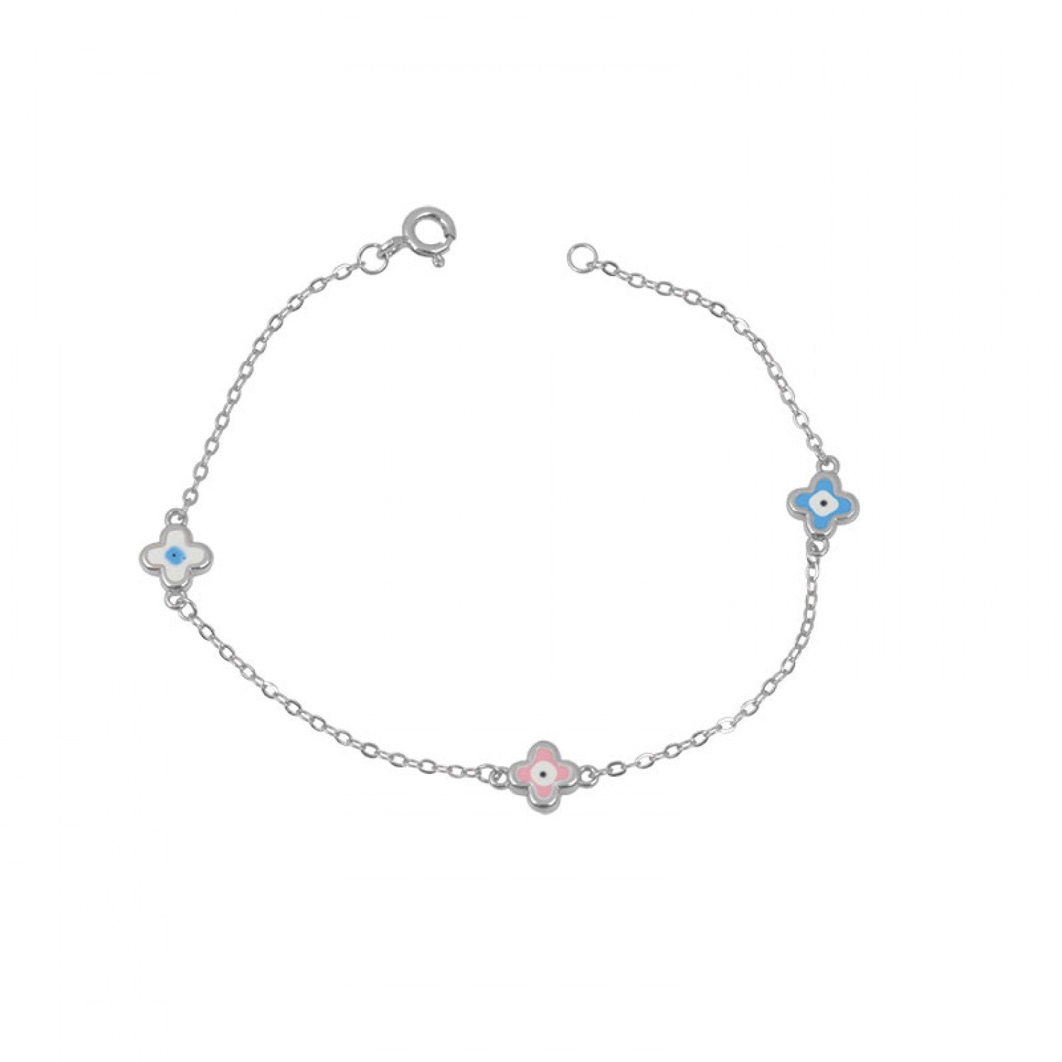 Детска сребърна гривна с цветчета, апликирани с цветен емайл. Забавен дизайн, който ще предизвика много детски усмивки. Идеален подарък за малки кокетки.