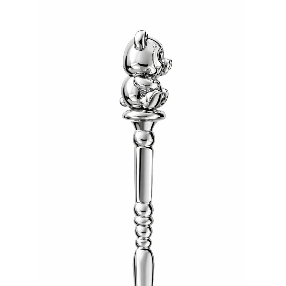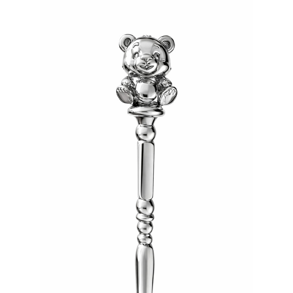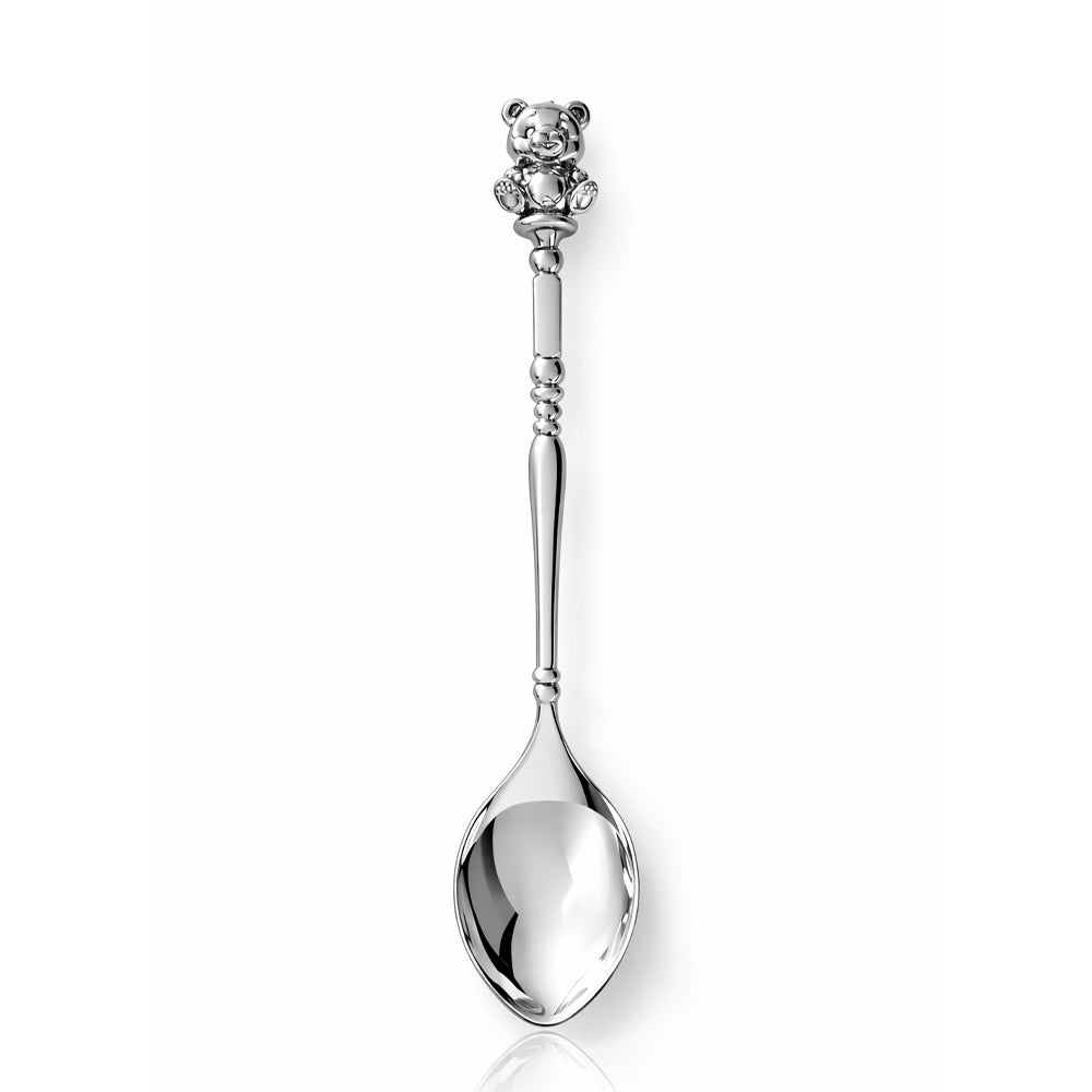 Детска ръчно изработена сребърна лъжичка с красива дръжка с форма на приказно 3D релефно мече. Подходяща за реална употреба.