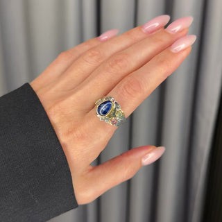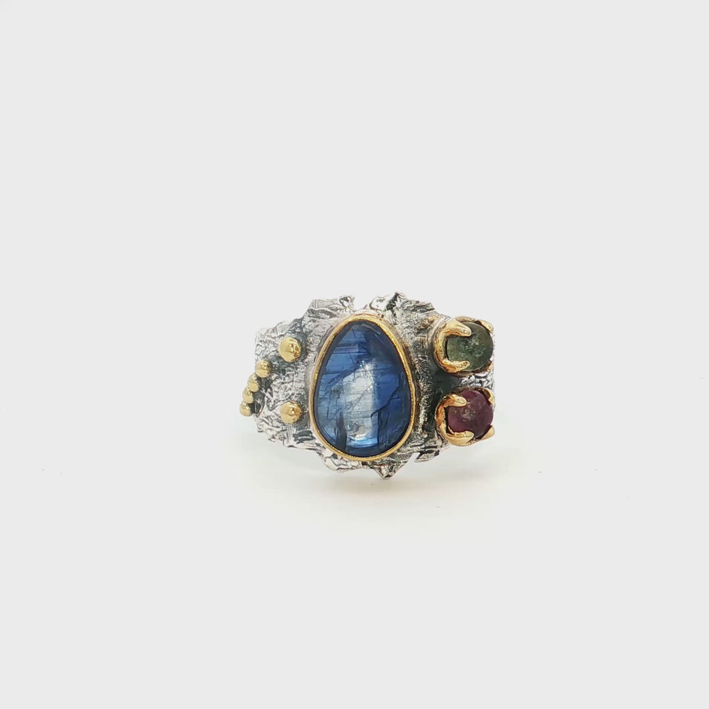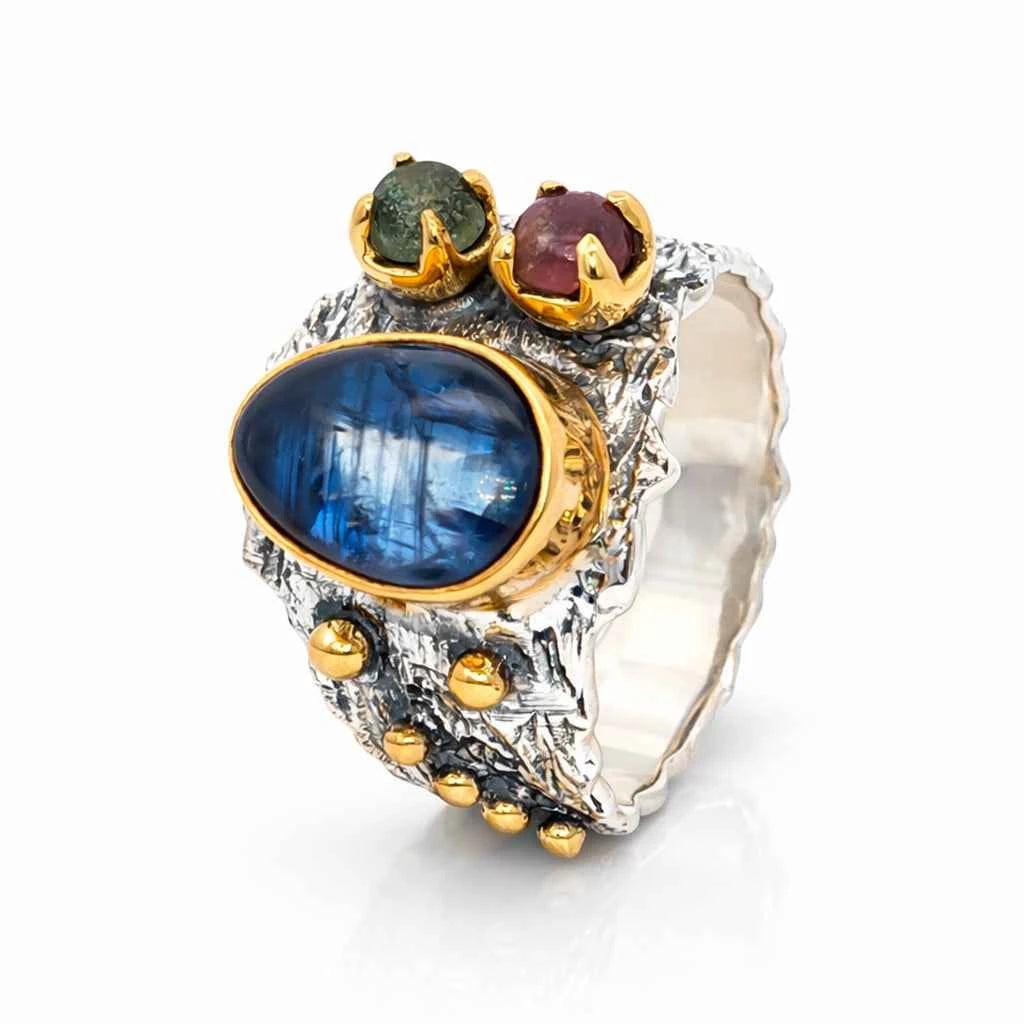 Сребърен дизайнерски пръстен с кианит и турмалини – артистично бижу с позлата и наситени цветове от колекция Unique.