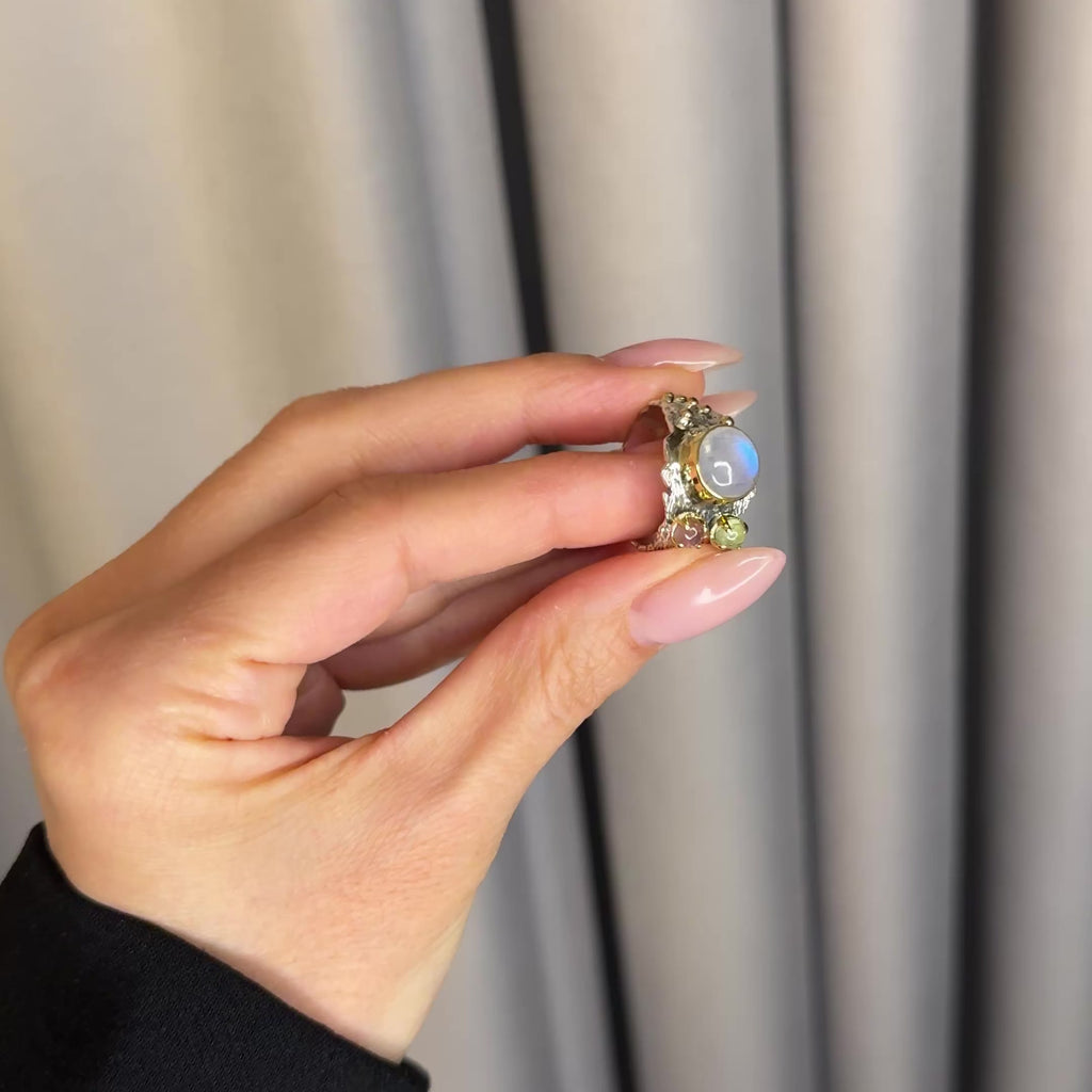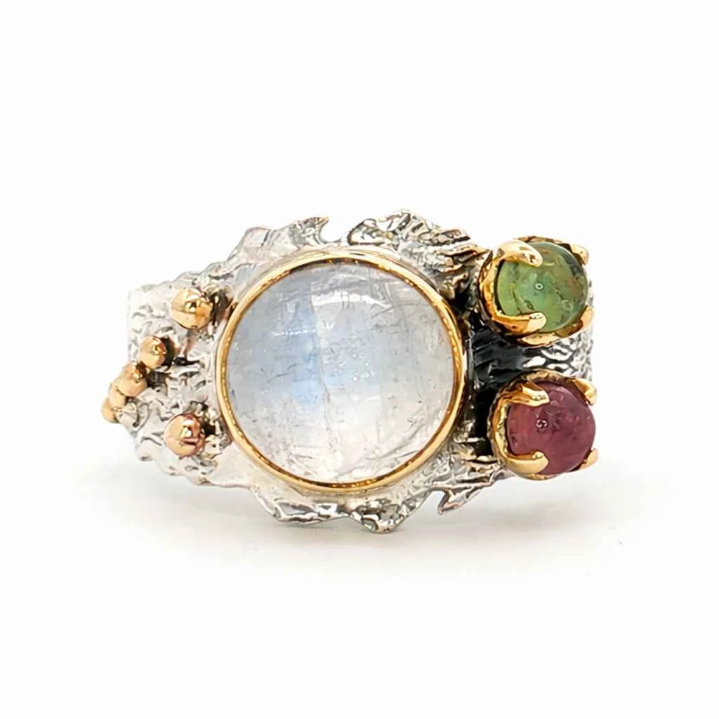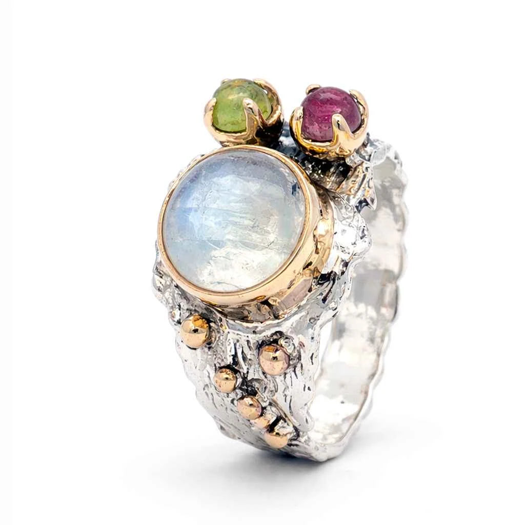 Сребърен дизайнерски пръстен с лунен камък и турмалини – артистично бижу с позлата от колекция Unique.