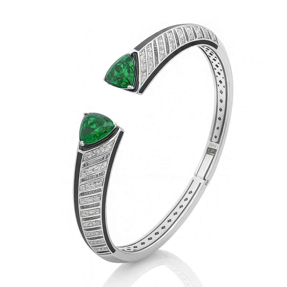 Изработена от сребро 925, тази твърда гривна съчетава архитектурна линия с прецизно подредени цирконии и фин черен емайл. Контрастът между цветовете е умишлен и категоричен, а скритата закопчалка на панта запазва формата чиста и минималистична. Зелените акценти в двата края добавят силен фокус и усещане за завършен, колекционерски дизайн.