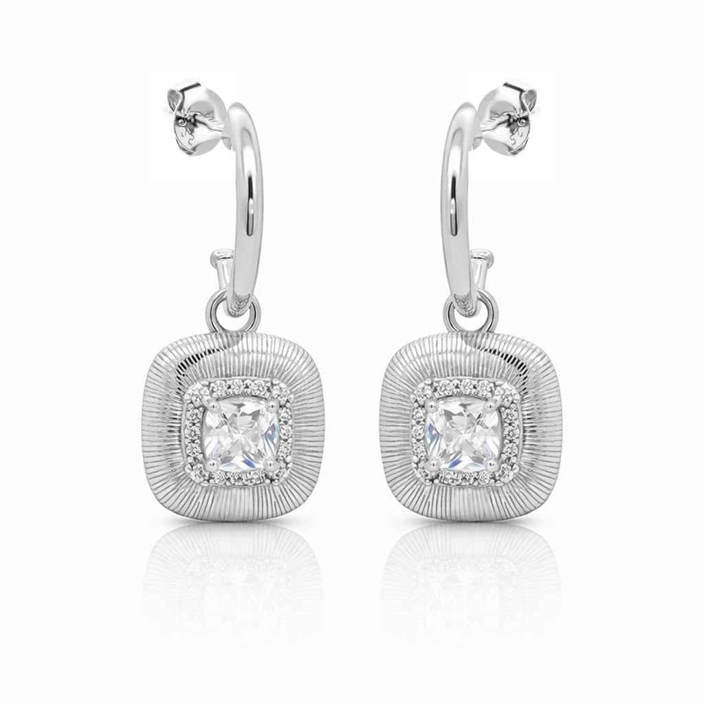 Сребърни обеци с квадратна форма, умерена дължина и централен камък с фин ореол от цирконии. Релефен дизайн, устойчив на надраскване – идеален за офис, ежедневие и специални поводи.
