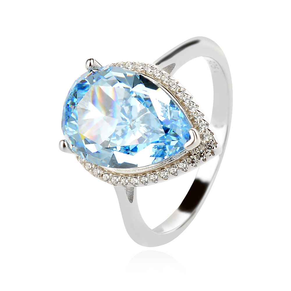 Сребърен пръстен със син цирконий капка, в хало от цирконии. Камъните са с прецизна шлифовка, клас ААА+. Бижуто е с перфектна изработка и родиево покритие, което предпазва среброто от оксидация.