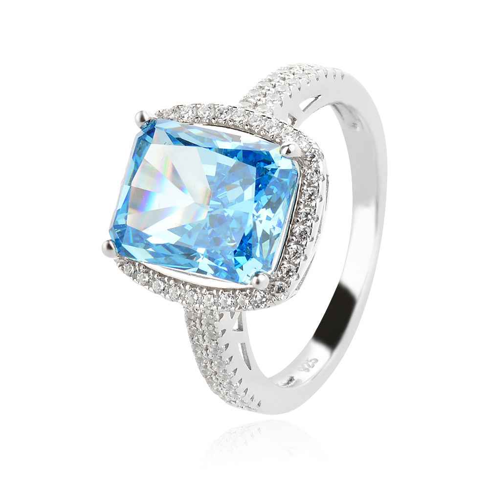 Сребърен пръстен със син цирконий, radiant cut с прецизна шлифовка, клас ААА+. Халката е обсипана с цирконии за още повече разкош. Бижуто е с перфектна изработка и родиево покритие, което предпазва среброто от оксидация. Размерът на халката е фиксиран и не подлежи на корекция.