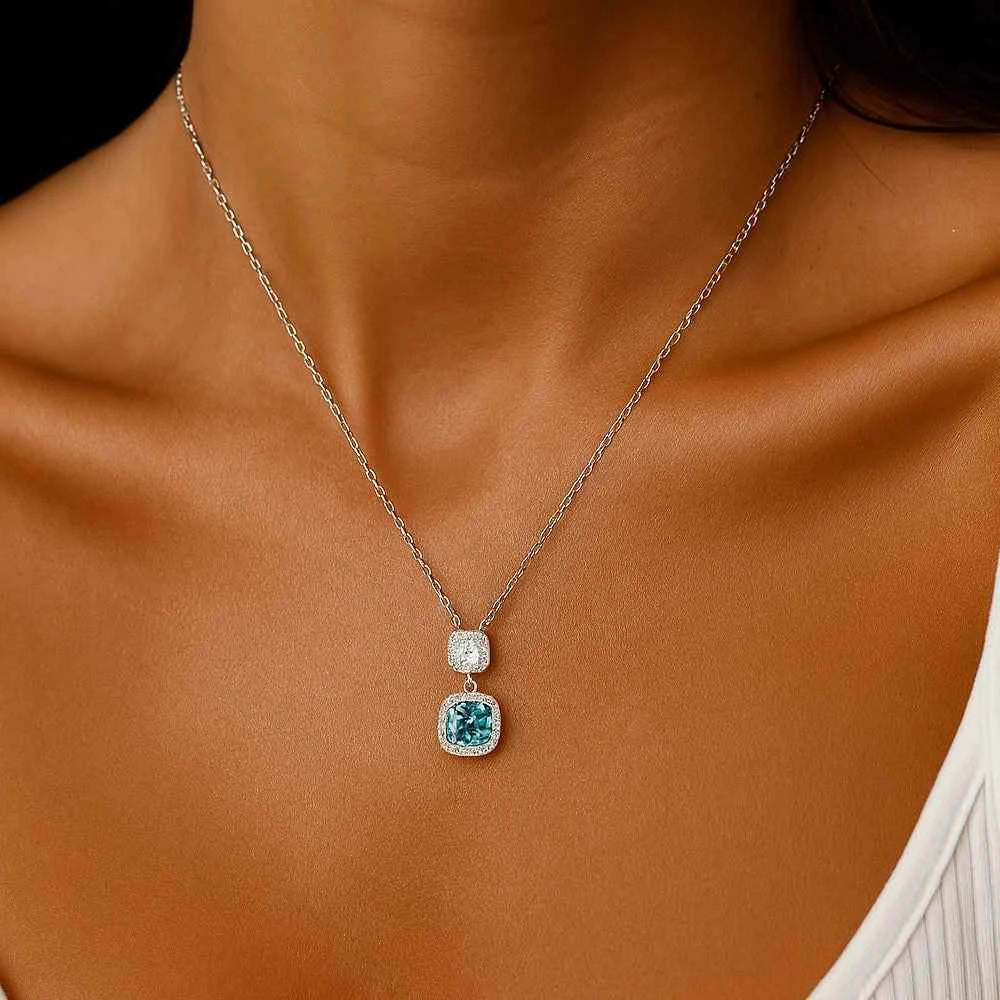 Сребърно колие с два квадратни кубични циркония в бяло и синьо, всеки в хало от малки цирконии за разкош – блестящ акцент с класическо излъчване.