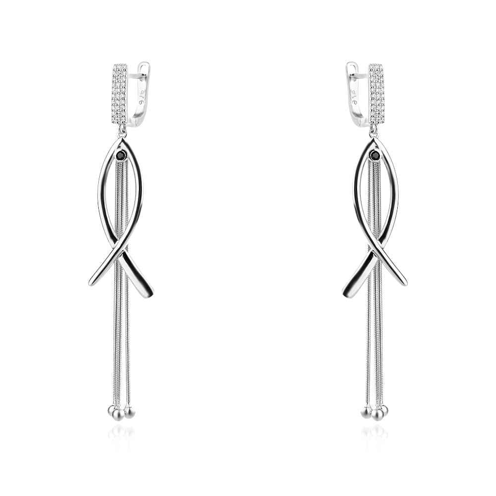 Елегантни висящи сребърни обеци с цирконии и родиево покритие. Обеците са с удобно английско закопчаване.