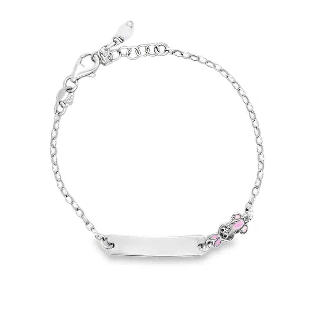 Нежна бебешка гривничка от сребро с родиево покритие, с малка плочка и зайче, ръчно апликирано с цветен емайл. Разполага с удължител за лесна корекция на дължината. Плочката може да бъде допълнително персонализирана с лазерна гравюра на лицето или на гърба с име, буквичка, дата или кратко послание, носейки спомен за цял живот.