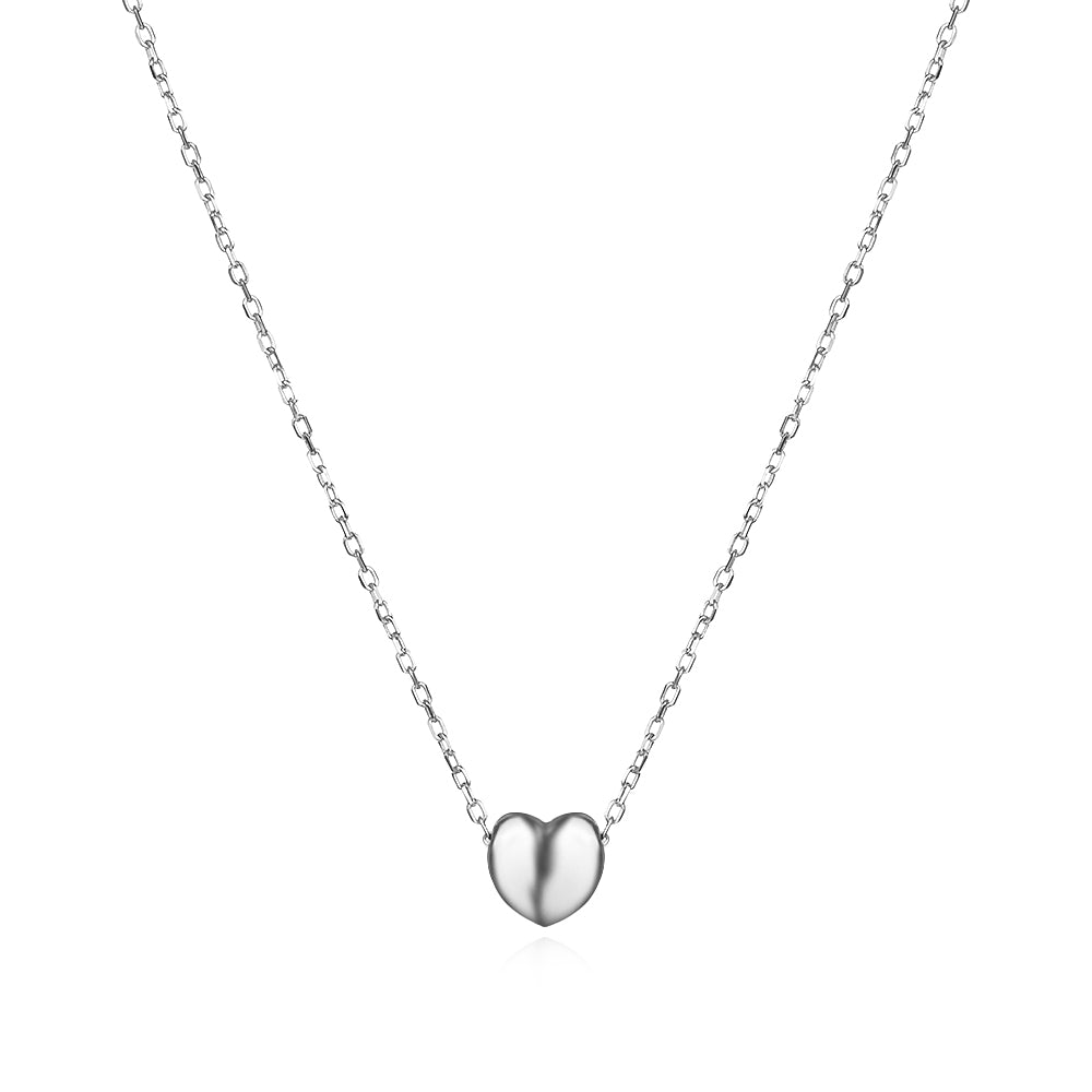 Сребърно колие с миниатюрно полирано до блясък сърце. Родиевото покритие запазва блясъка на бижуто, а удължител в края на синджирчето позволява удобно коригиране на дължината.