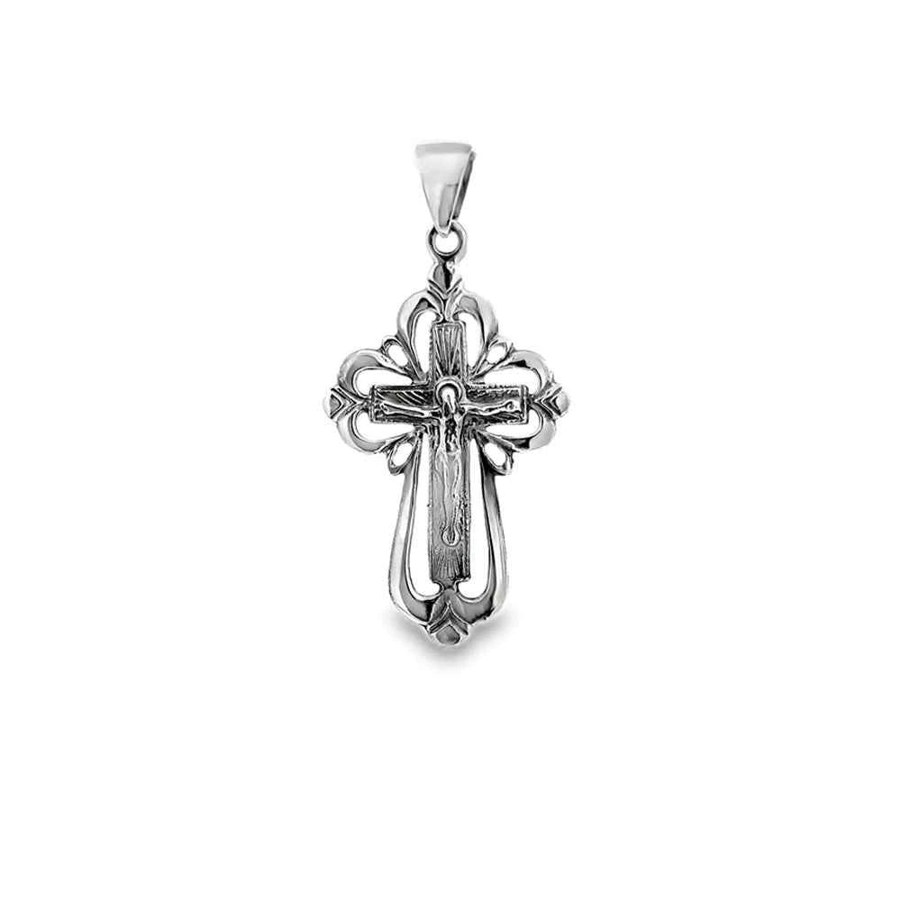 Православен сребърен кръст от колекция Sevar. Бижуто е с разпятие на лицевата страна. Кръстът е с прецизна и детайлна изработка и фабрична оксидация, която подчертава релефните декоративни елементи.