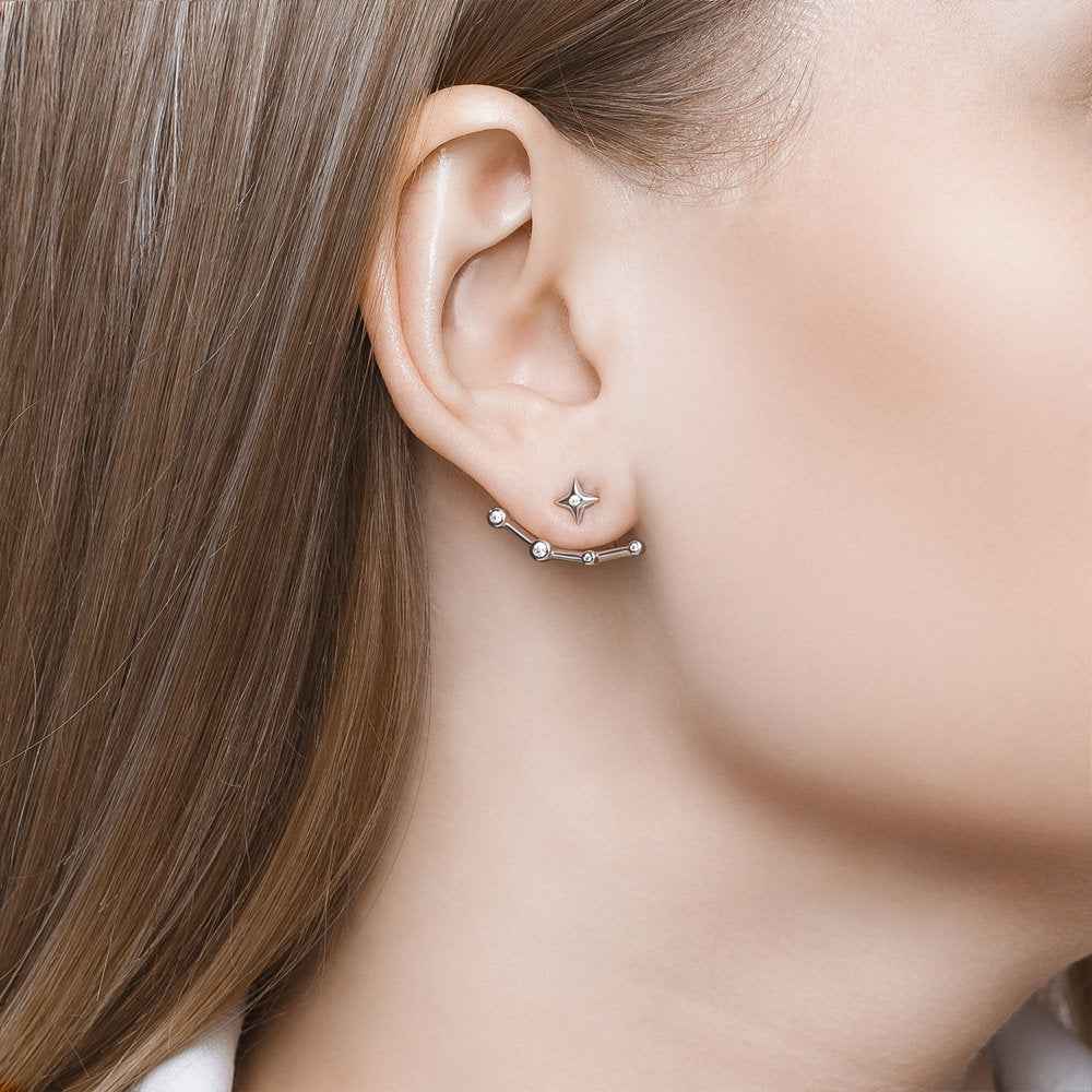Модерни сребърни обеци- трансформъри. Модел 2 в 1 с подвижна декоративна част, която е прикрепена към основата. Подвижната част може да се постави или премахне, което ви позволява да носите обеците по два начина: като малки класически обеци на винт под формата на звезди или като цяло съзвездие - зависи от вас!