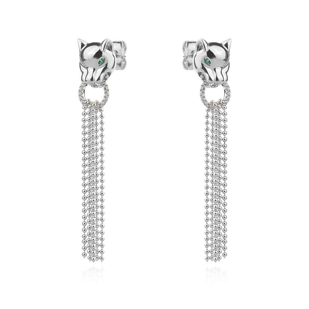 Сребърни обеци пантери с прецизна изработка и перфектна полировка. Тези съблазнителни изкушения са вдъхновени от емблематичната колекция на Cartier Panthere. Обеците са с родиево покритие, което предпазва среброто от оксидация и запазва блясъка на бижуто.Закопчаването е на щифт.