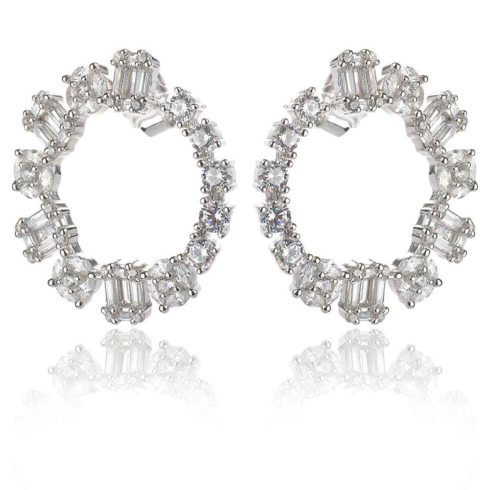 Сребърни обеци с родиево покритие и инкрустация на кръгли и багети цирконии. Тези бляскави кръгове са с едва доловима извивка и щом се поставят на ухото, тънката част от кръга се скрива зад мидичката- фантастичен 3D дизайн, който ще прикове любопитните погледи :)
