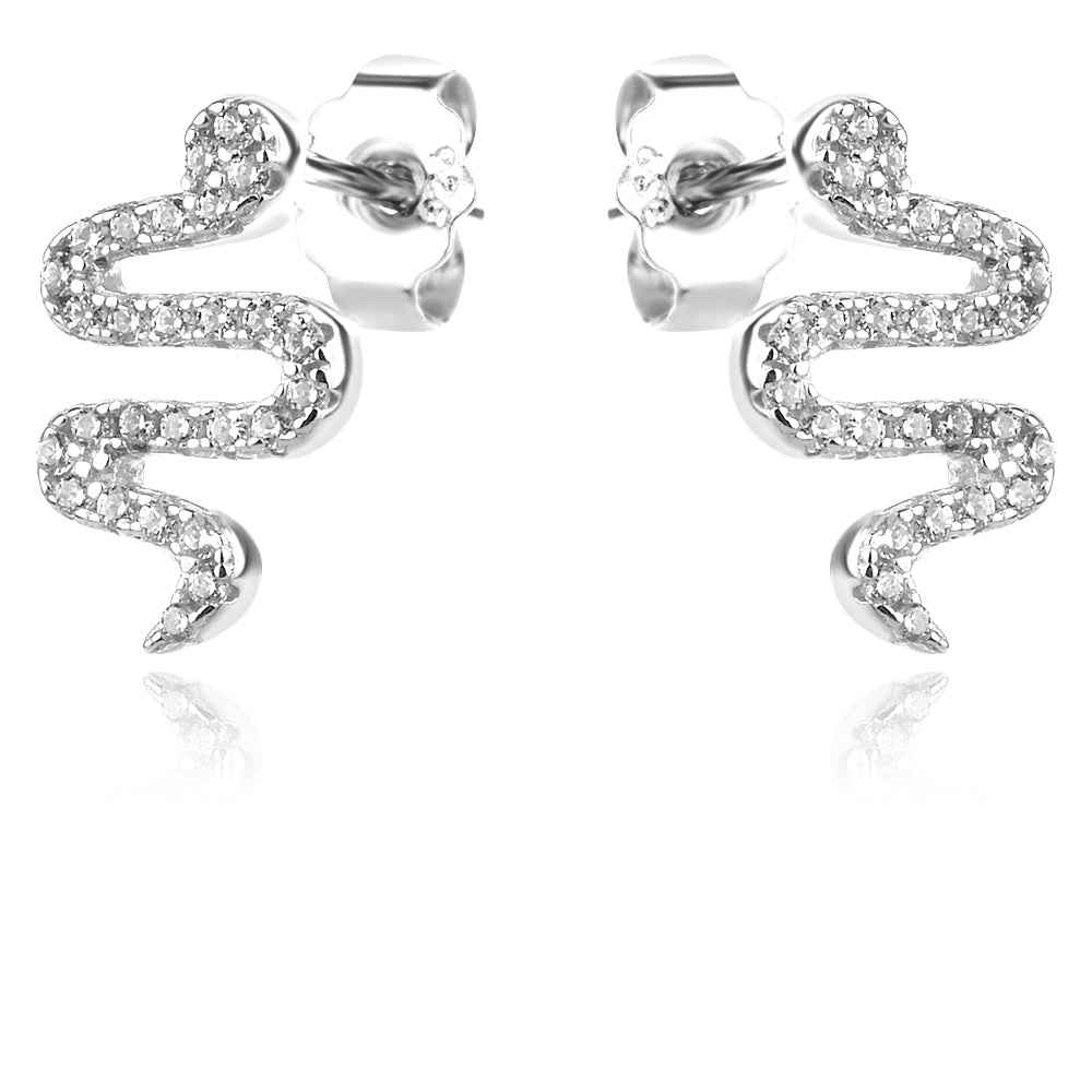 Малки фини обеци на щифт във формата на стилизирани змии, обсипани с цирконий. ОБеците са с родиево покритие, което предпазва среброто от оксидация и запазва блясъка на бижуто.