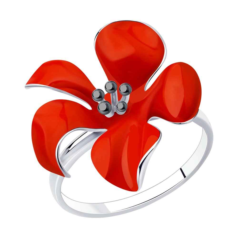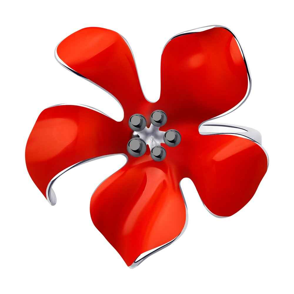 Ярък сребърен пръстен с ръчно рисуван червен емайл, тичинки от черен рутений и прецизно родиево покритие. Малък изящен детайл, с който да разнообразите всяка семпла визия. Халката е фиксирана и размерът на пръстен не подлежи на корекция