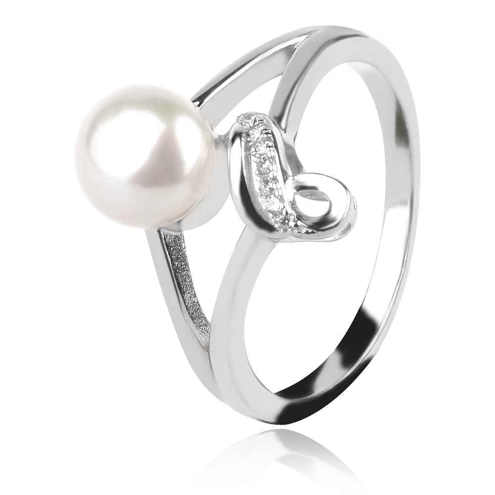 Сребърен пръстен с млечно бяла перла и цирконии. Перлата е монтирана на щифт.