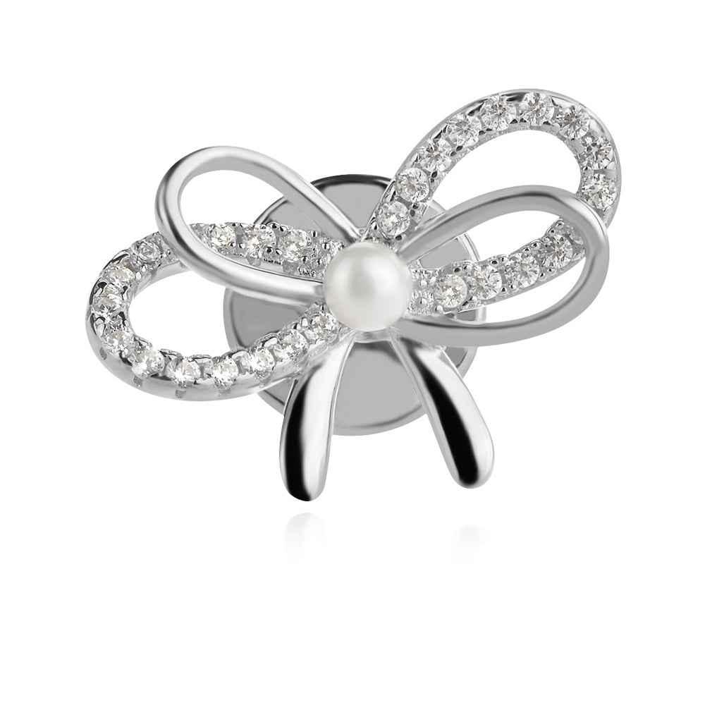 Изящна и женствена, тази сребърна брошка във форма на панделка е символ на елегантност и финес. Инкрустирана е с бяла перла и малки кубични цирконии за деликатен блясък. Перфектен аксесоар за стилна визия – идеален за палто, сако, шал или вечерна рокля. Закопчаването е с магнит.