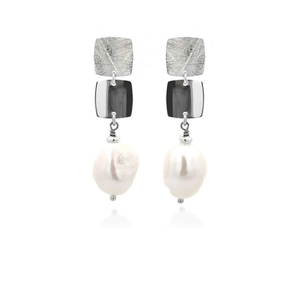 Италиански сребърни обеци с барокови перли. Стилна комбинация от текстурирани и гладки повърхности в модерна геометрия и естествена красота. Закопчаването е на щифт.
