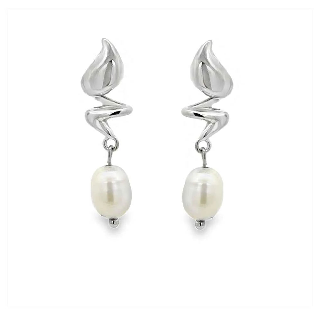 Тези сребърни обеци впечатляват с артистичната си горна част – извивка, напомняща стилизирана вълна или пламък – и нежна капковидна перла, която се поклаща в основата. Дизайнът е едновременно модерен и женствен, а контрастът между огледалното сребро и мекотата на перлата придава усещане за дълбочина и завършеност. Подходящи както за ежедневни визии с изискан акцент, така и за специални поводи.