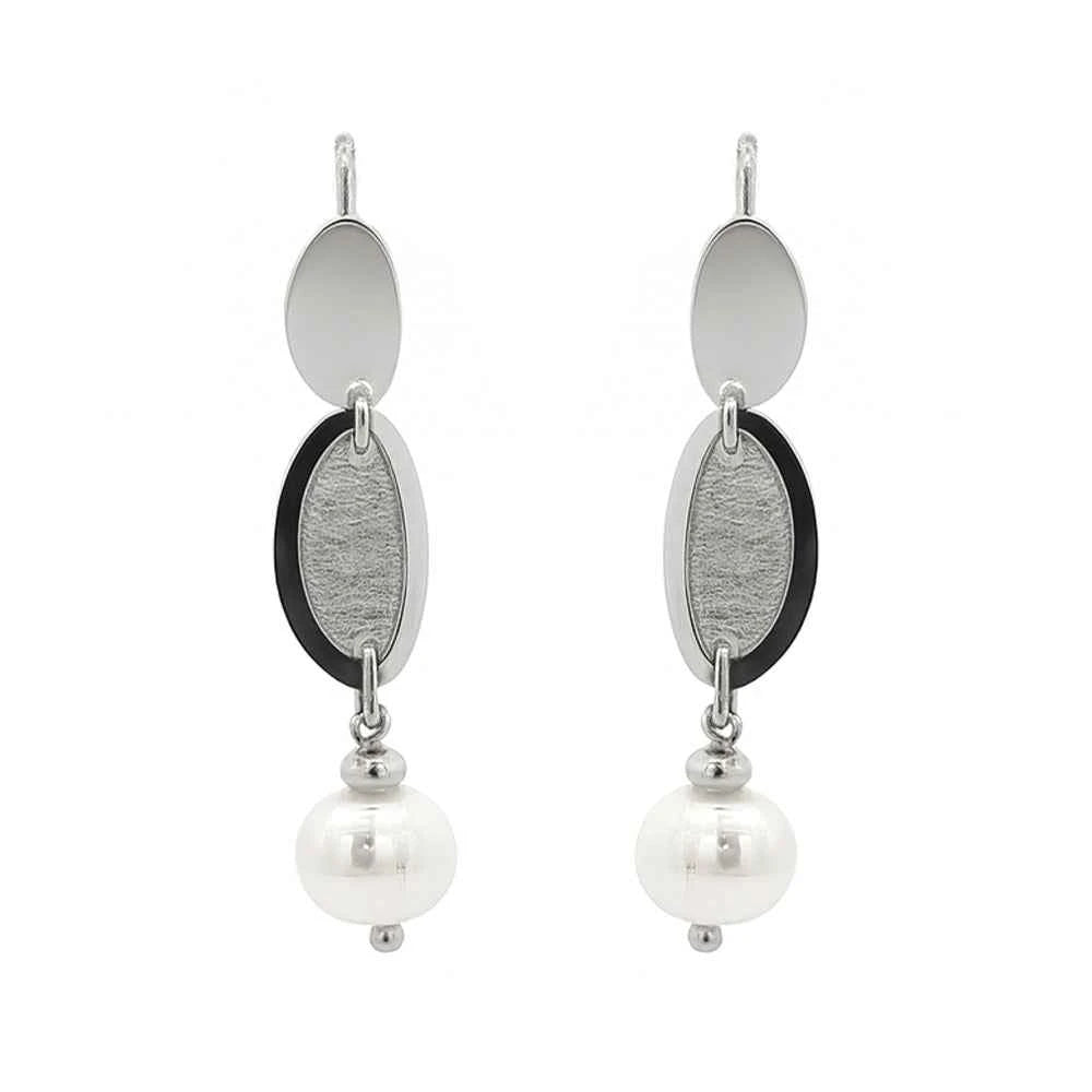 Сребърни обеци Pearl Bella – модерна геометрия, текстуриран детайл и фина перла за елегантен стил.