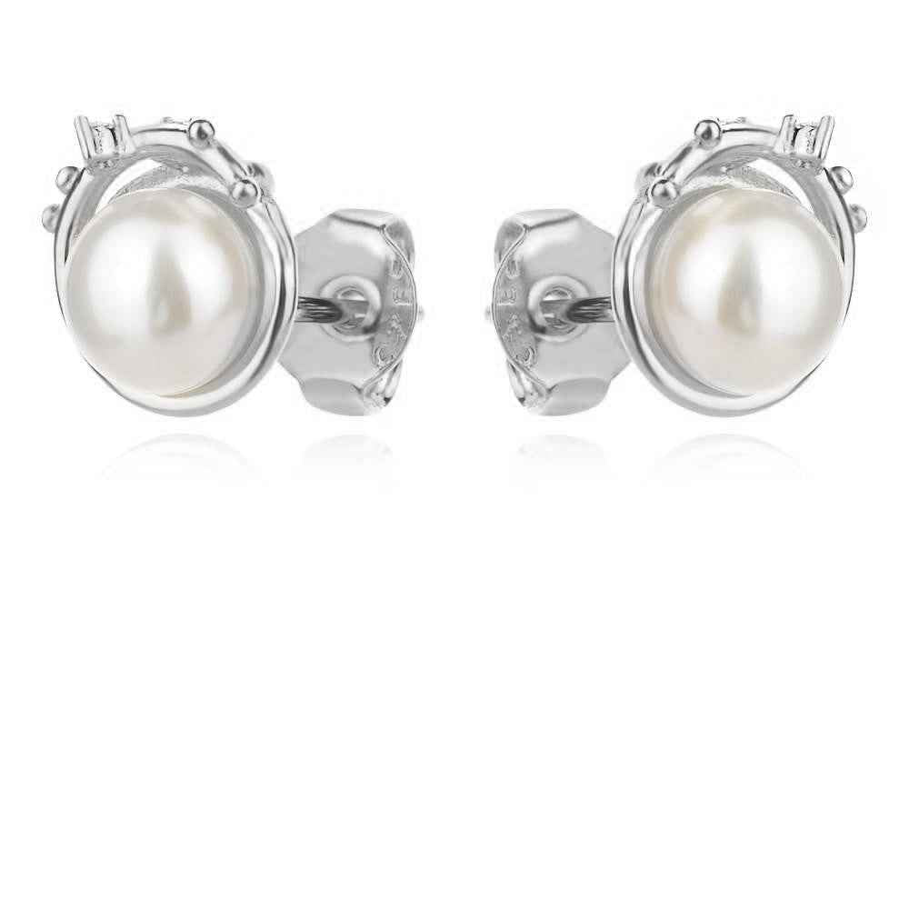 Сребърни обеци с перла, цирконии и родиево покритие. Обеците са с изключително фина изработка. Закопчаването е на щифт.