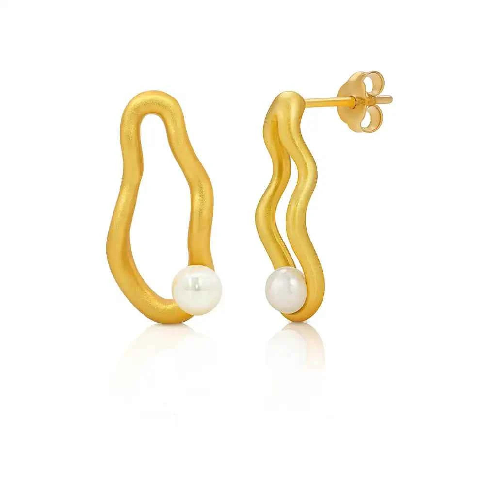 Позлатени сребърни обеци Pearl Flow с органична вълнообразна форма и перлен акцент. Модерен, арт детайл за стилни ежедневни визии.