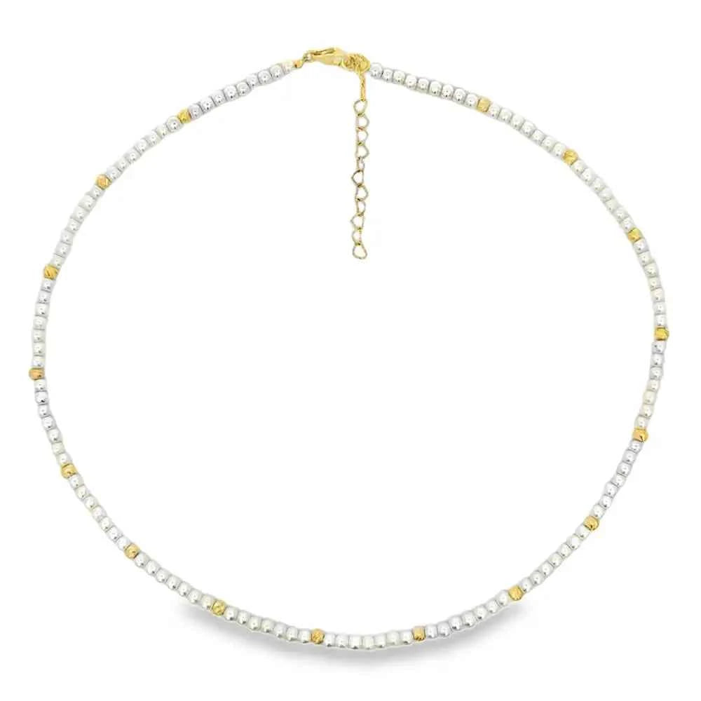 Сребърно колие наниз от перли и позлатени сребърни топчета. Минималистичният дизайн с ритмична последователност създава усещане за хармония и модерна елегантност. Перфектно допълнение за жени, които обичат да съчетават класиката с актуалните модни тенденции.