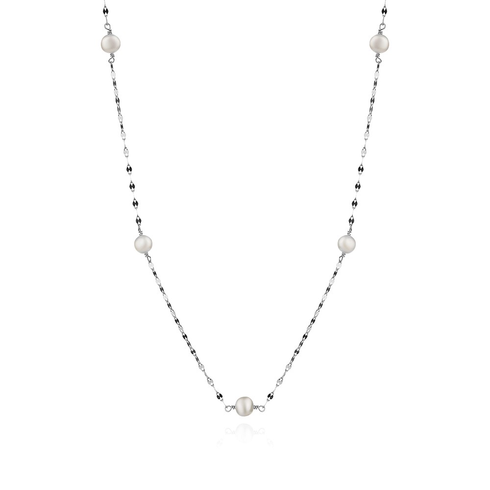 Модерен прочит на класическите перли. Приказно сребърно колие с перли, вплетени в нежен гъвкав синджир с релефен дизайн, който красиво отразява светлината при всяко движение.