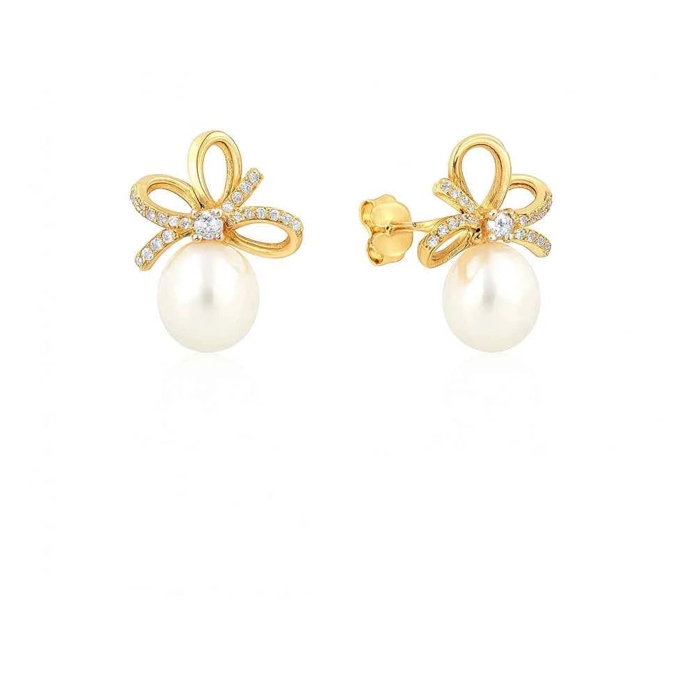 Елегантни сребърни обеци с позлата, перли и цирконии във форма на панделка – модерна романтика и изискан блясък за всеки повод.