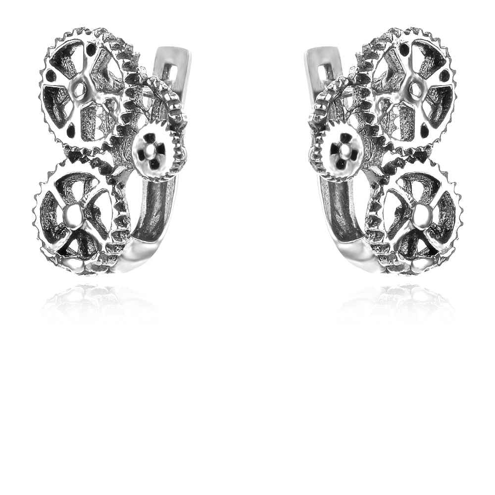 Сребърни обеци в стил steampunk, част от българската ни колекция “Алгара”??. Обеците са с оксидация, която подчертава релефните декоративни елементи. Удобно английско закопчаване.