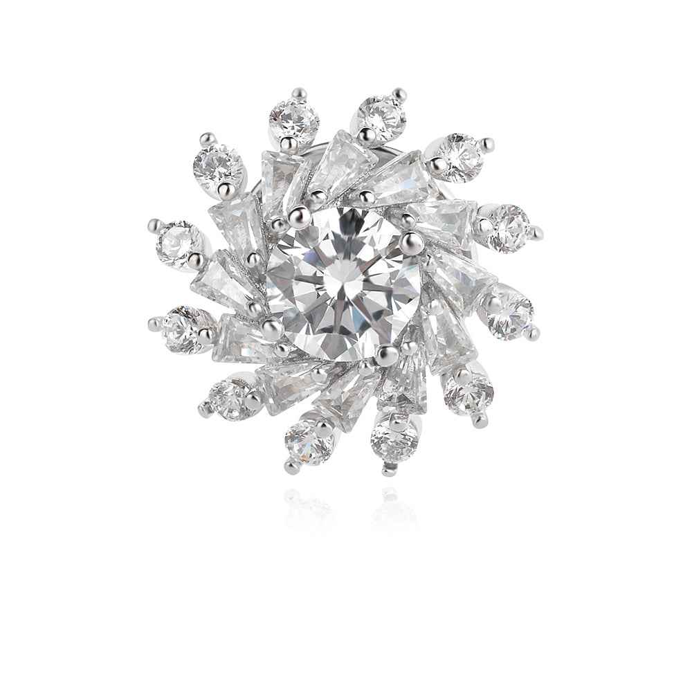 Малка елегантна сребърна брошка с кубични цирконии за сияен блясък. Кръглия симетричен дизайн я прави перфектна за поставяне както на ревер, така и на пуловер, шал, шапка или като акцент на рокля или риза.