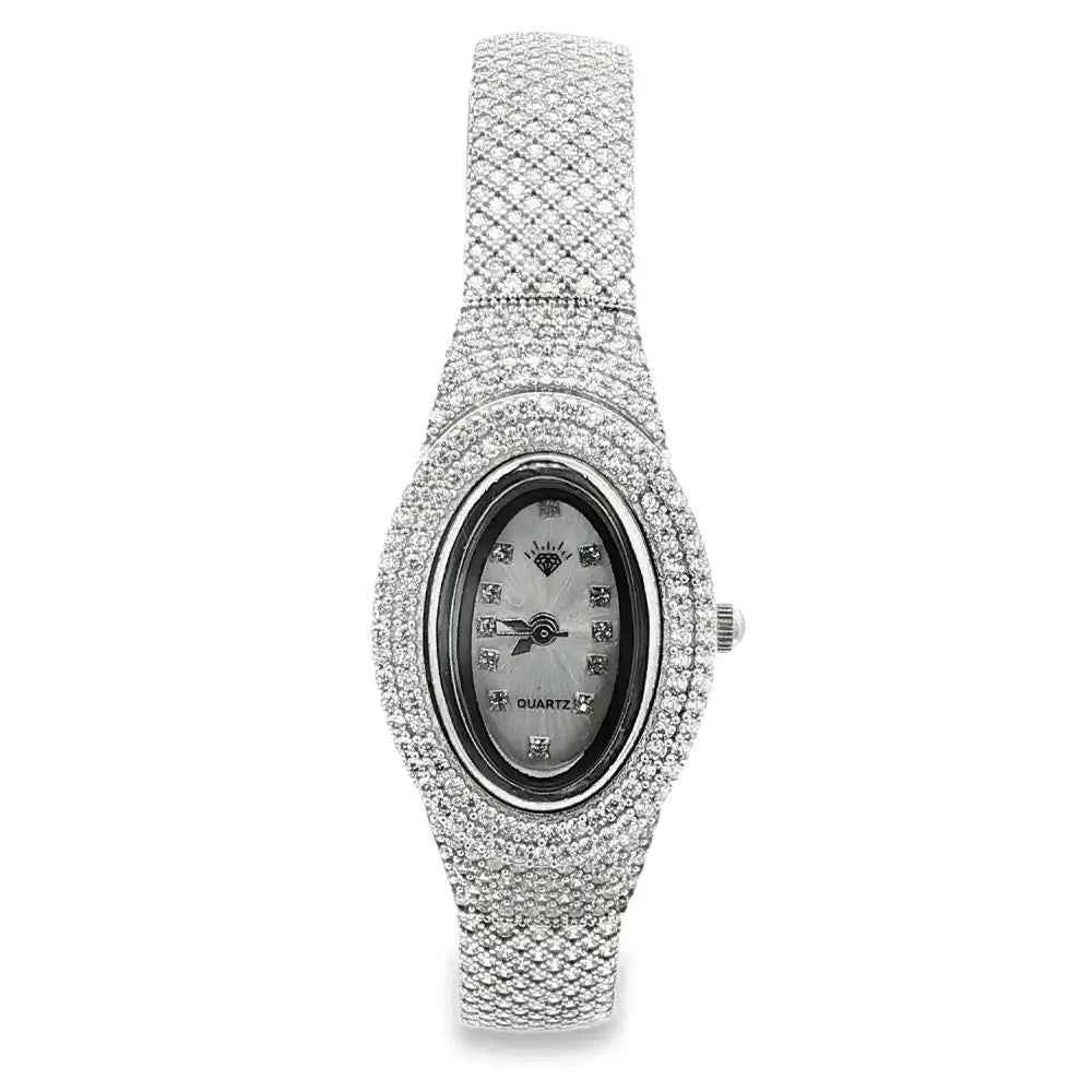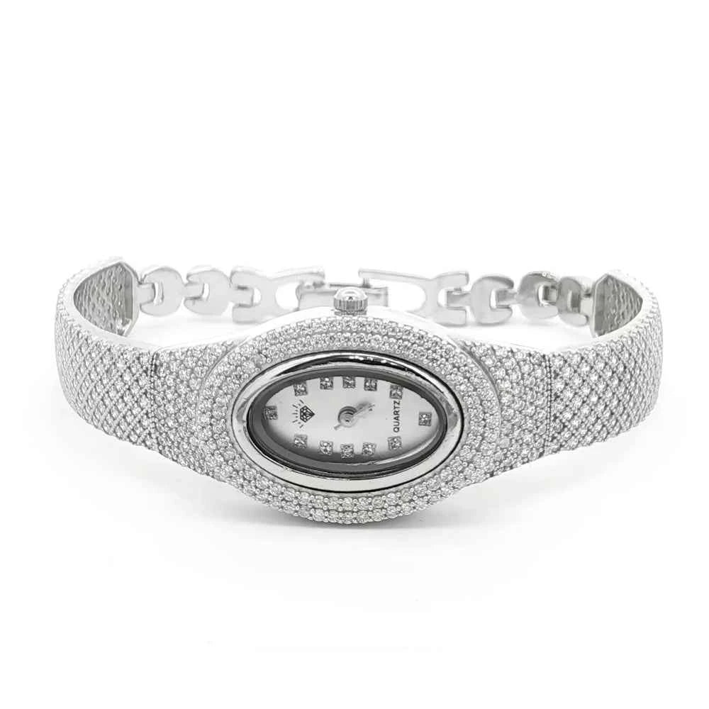 Сребърен часовник с цирконии и родиево покритие за жени с усет към модерния лукс.