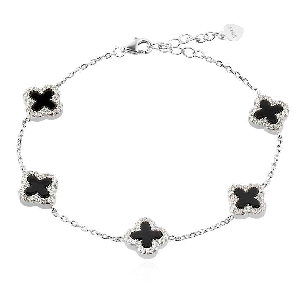 Нежна сребърна гривна с родиево покритие и пет стилизирани цветя от черен оникс в обков обсипан с цирконии. Тази вечна елегантност е вдъхновена от листата на детелината и напомня за колекциите на Van Cleef & Arpels.