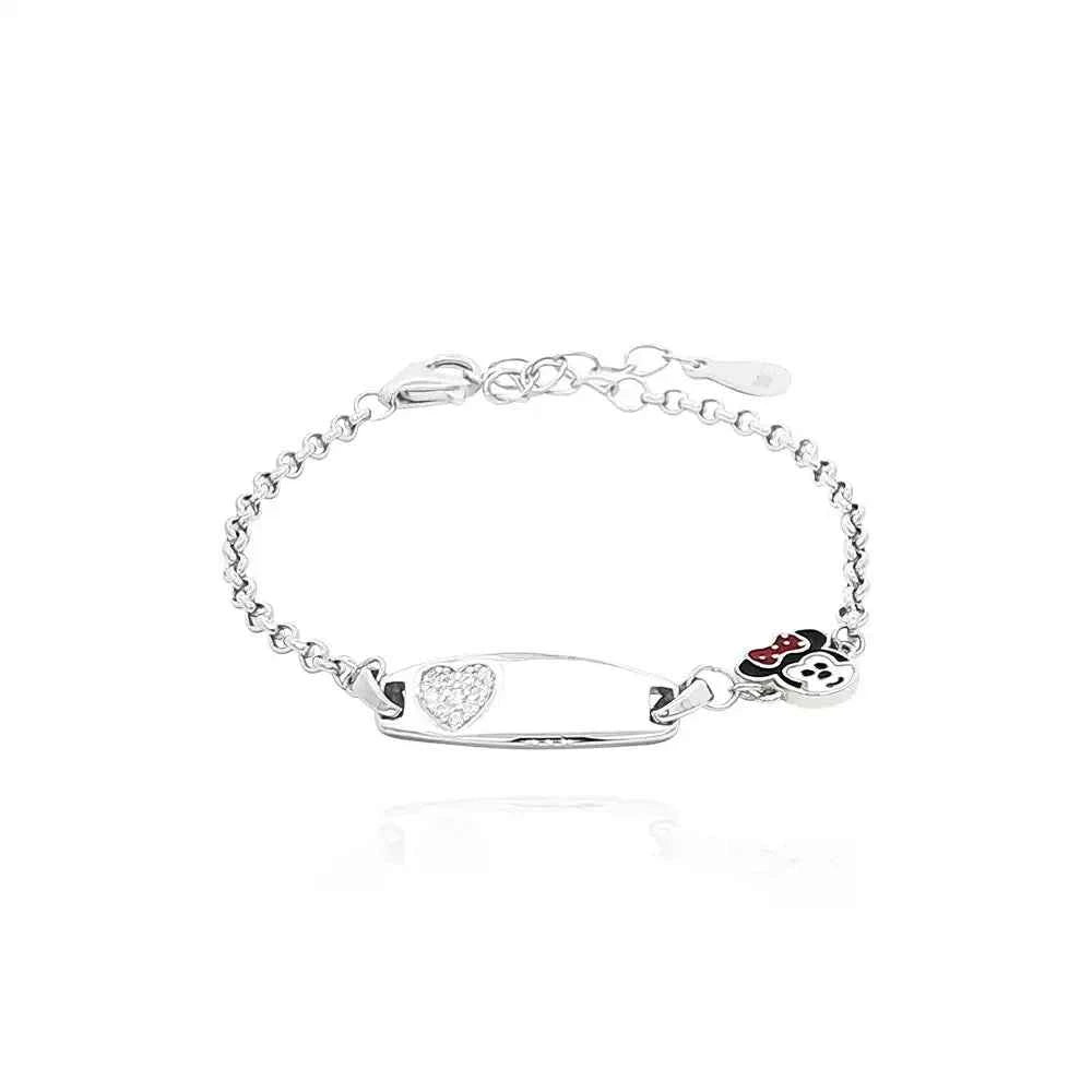 Детска сребърна гривна с Мини Маус, блестящо сърце и плочка за гравиране.