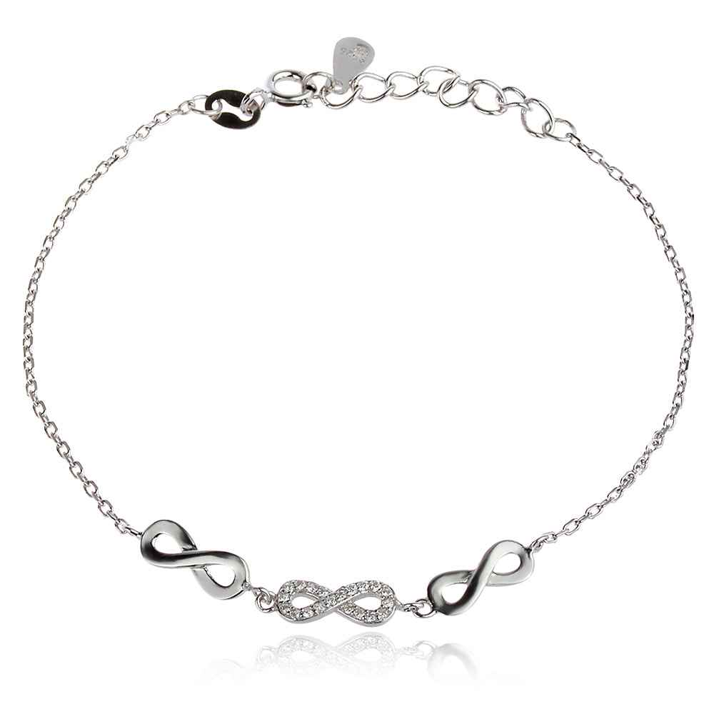 Нежна сребърна гривна с циркони и символи на безкрайност. Бижуто е с родиево покритие, което предпазва среброто от потъмняване. Удължител от халкички позволява удобна корекция на дължината.