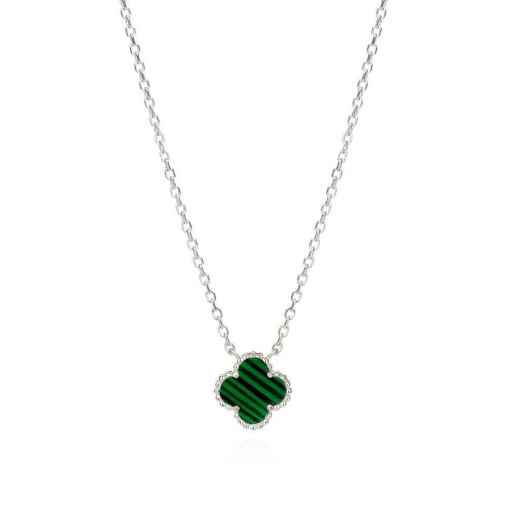 Нежнo сребърно колие с родиево покритие и стилизирано цвете от зелен малахит. Тази вечна елегантност е вдъхновена от листата на детелината и напомня за колекциите на Van Cleef & Arpels.