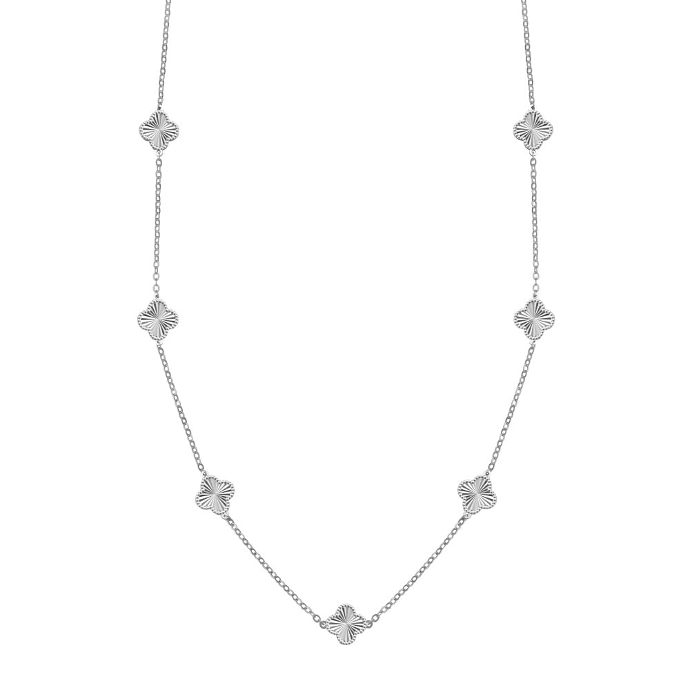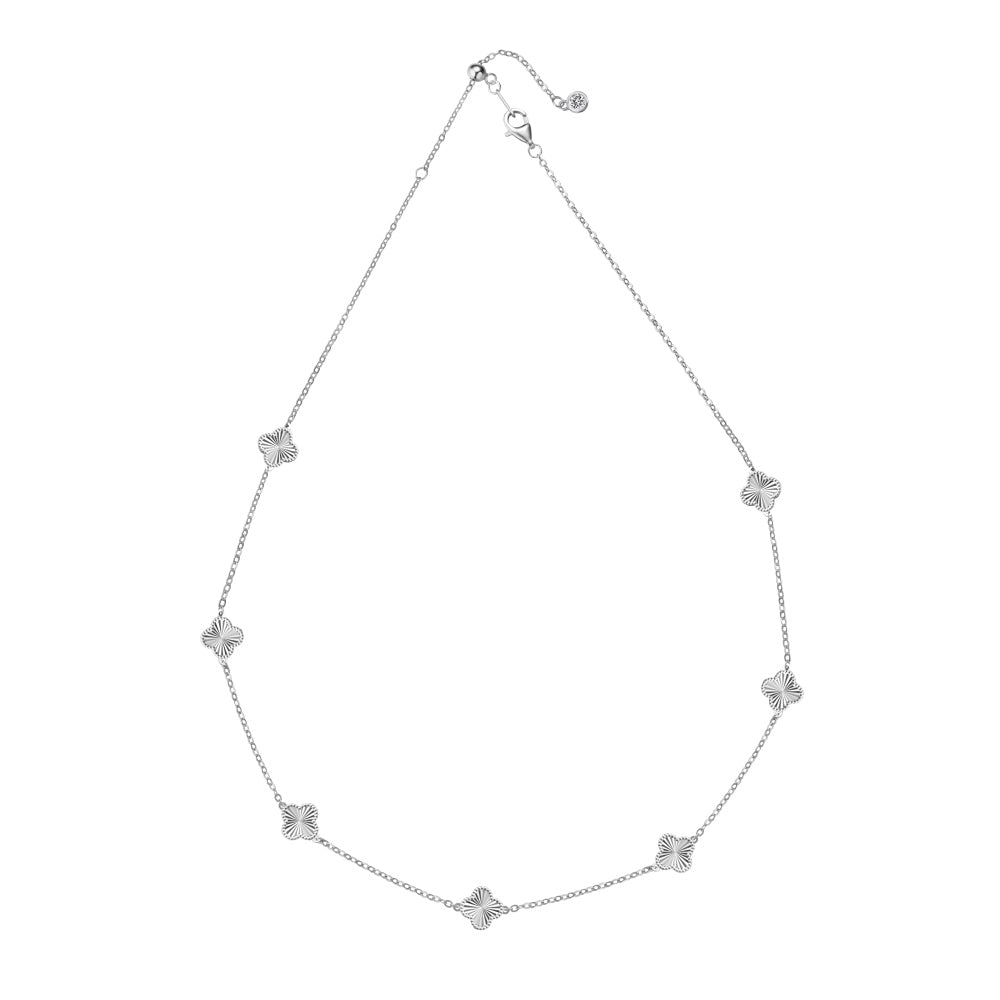 Сребърно колие със седем стилизирани флорални мотиви с лазерна обработка и прецизно родиево покритие, което предпазва среброто от оксидация. Комбинирай със сребърни обеци или гривна от същата серия за цялостна и премерена естетика.