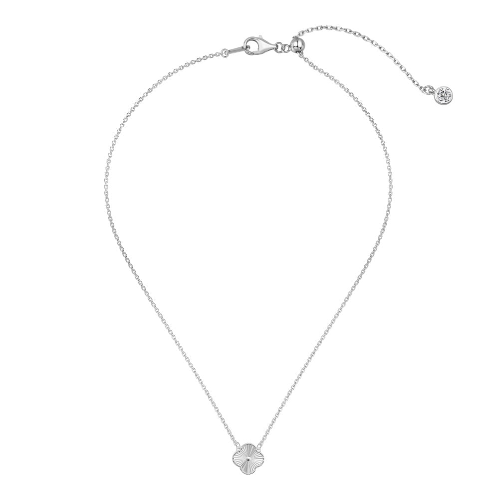 Сребърно колие със стилизиран флорален мотив, лазерна обработка и прецизно родиево покритие, което предпазва среброто от оксидация. Тази вечна елегантност е вдъхновена от листата на детелината и напомня за колекциите на Van Cleef & Arpels. Стилът е модерен, но достатъчно деликатен, за да се носи както самостоятелно, така и в съчетание с други аксесоари.