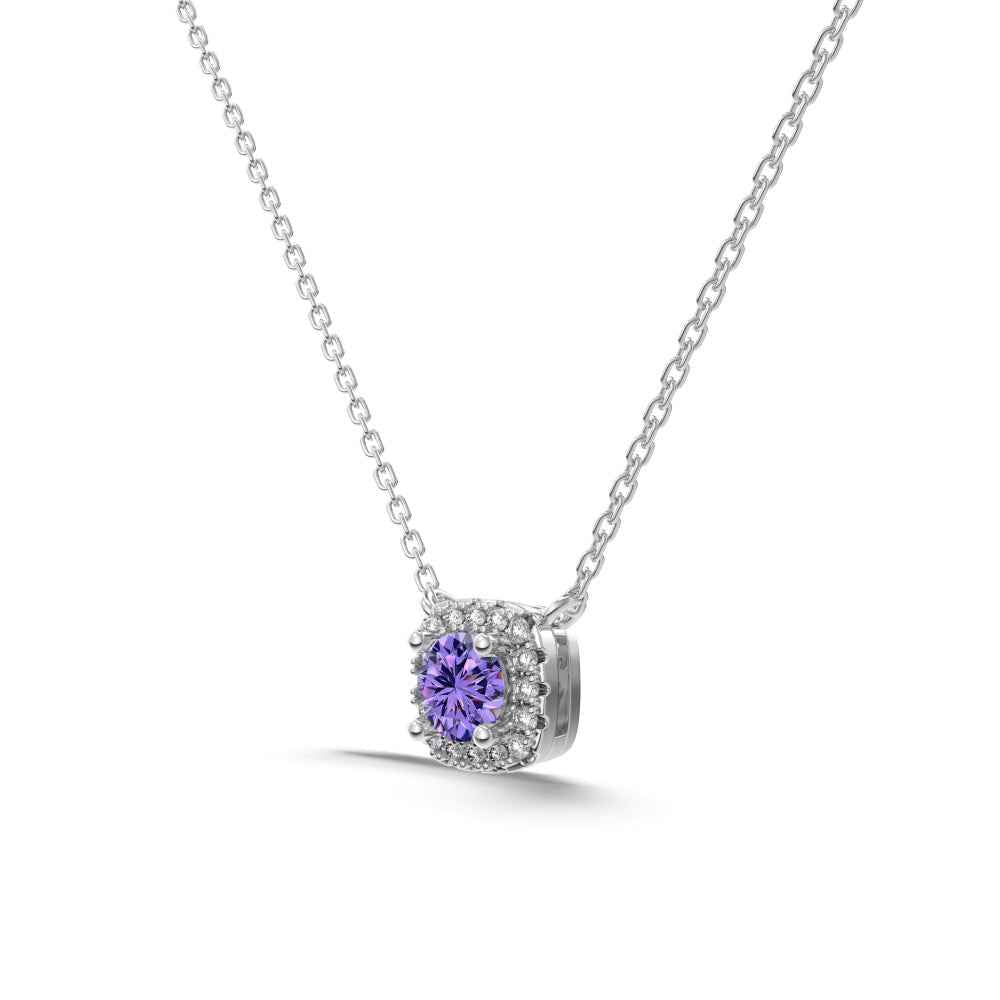 Колие със съвременно излъчване и ярък цвят – лилав централен кубичен цирконий в рамка от мини бели цирконии за разкош. Финото синджирче е с опция за корекция на дължината с 5см.
