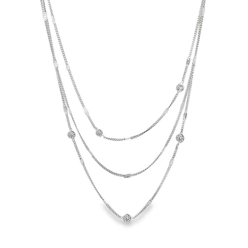 Многоредово сребърно колие с релефни елементи и блестящи кубични цирконии, подредени в изчистен баланс. Създадено да придаде дълбочина, блясък и леко сияние на всеки аутфит.