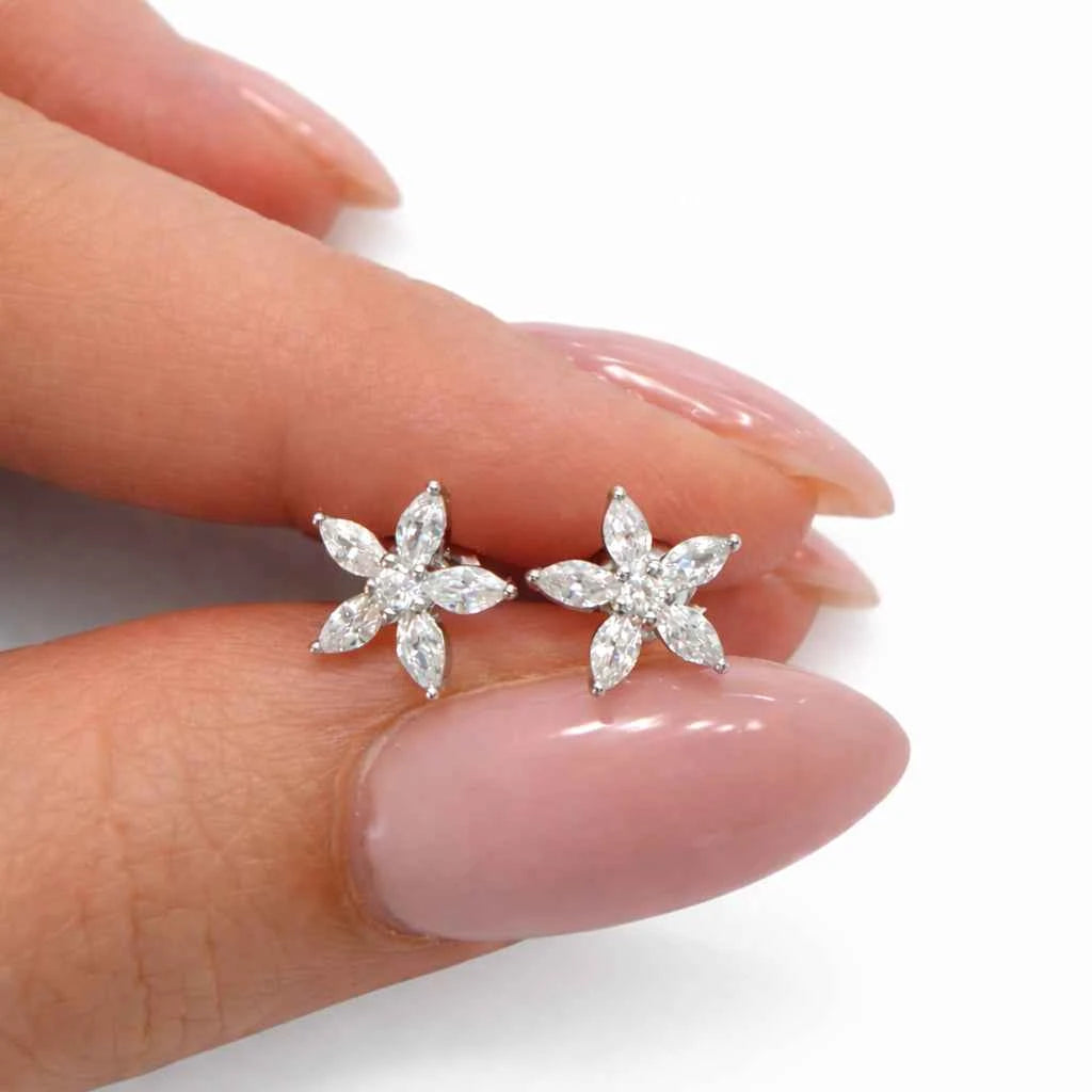 Сребърен флорален комплект от колие и обеци с цирконии. Нежен и елегантен дизайн с фин блясък.