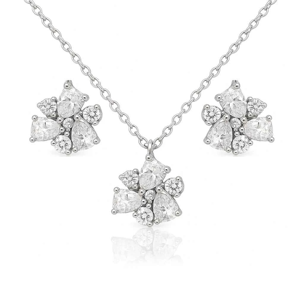 Сребърен комплект Crystal Bloom – обеци и колие с цветя от блестящи кубични цирконии.