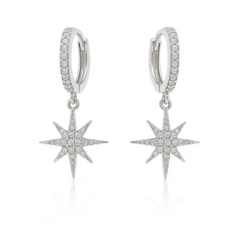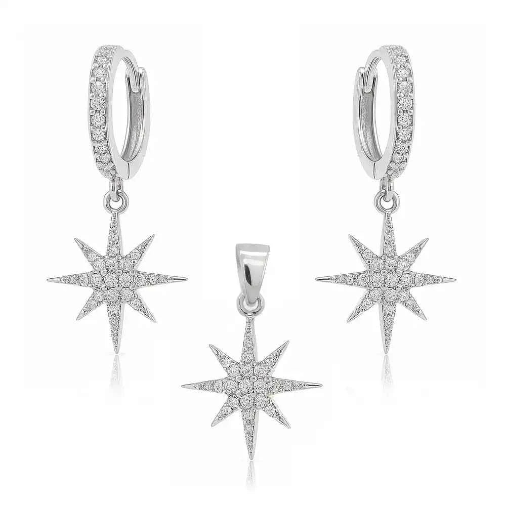 Сребърен комплект North Star – модерни обеци и медальон със сияеща звезда, обсипана с циркони. Ефектен, лек и идеален за ежедневно и вечерно носене.