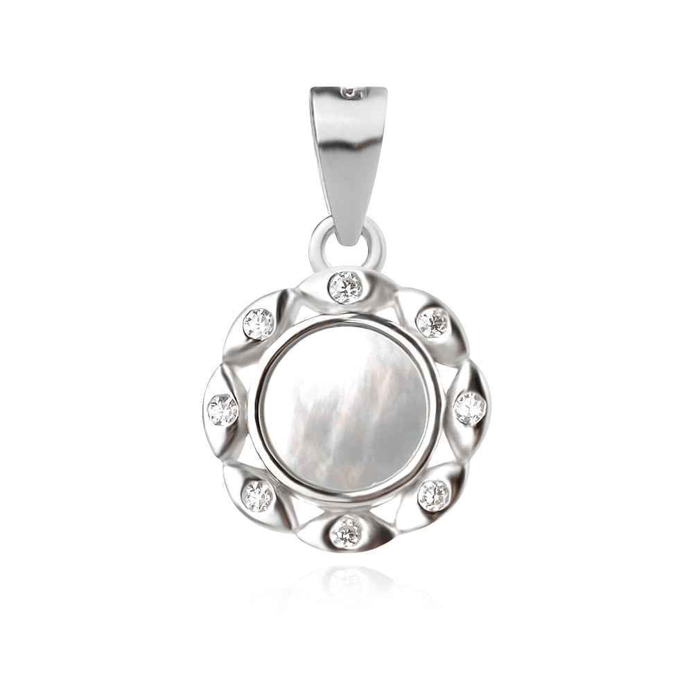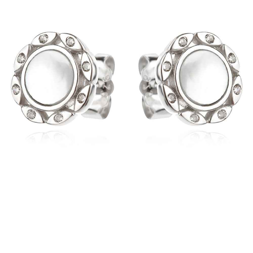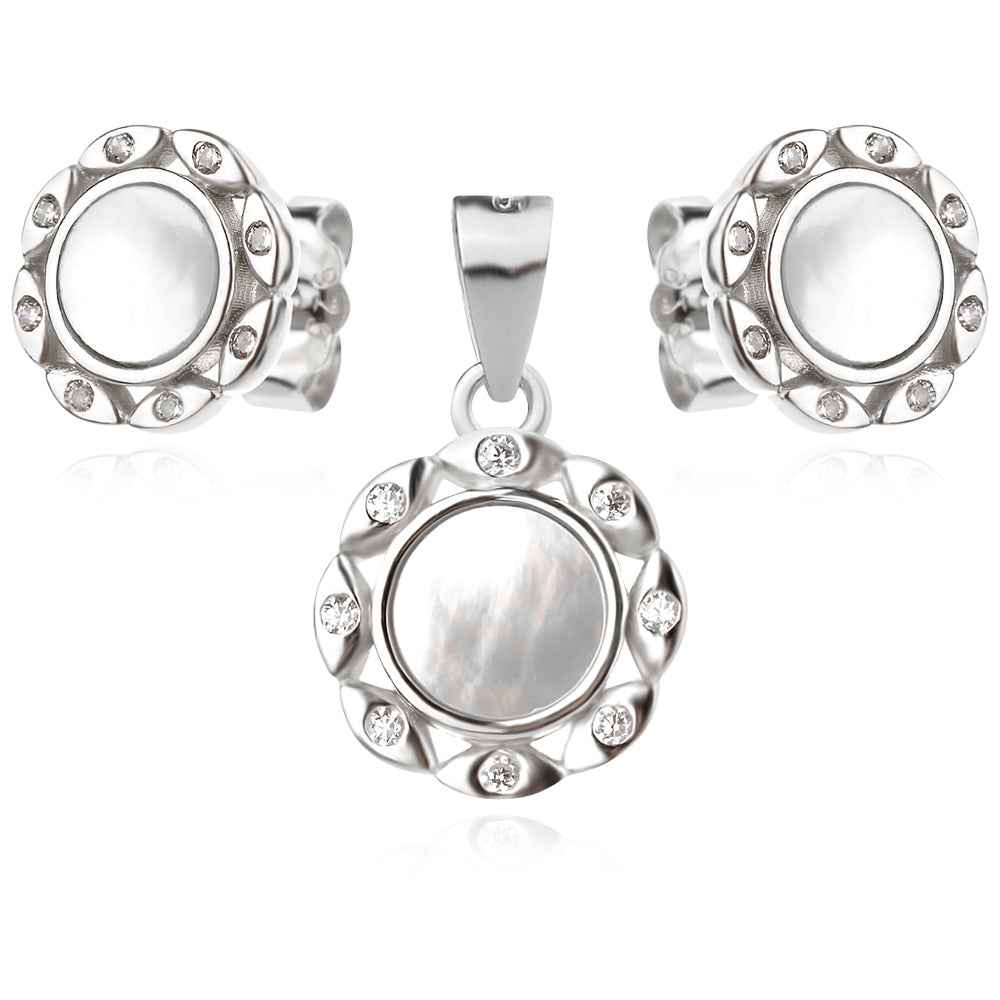 Подарете си слънце от бял седеф. Този сребърен комплект с цирконии и бял седеф ще грейне в стайлинга ви. Родиево покритие предпазва среброто от оксидация и запазва блясъка на бижуто. Обеците се закопчават на щифт.