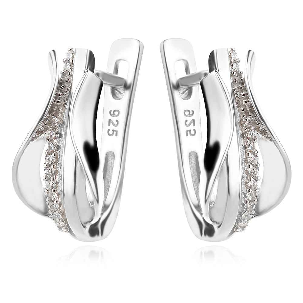 Елегантни сребърни обеци с красив абстрактен дизайн и деликатен блясък от цирконий. Обеците са с удобно английско закопчаване и прецизно родиево покритие, което предпазва среброто от оксидация.