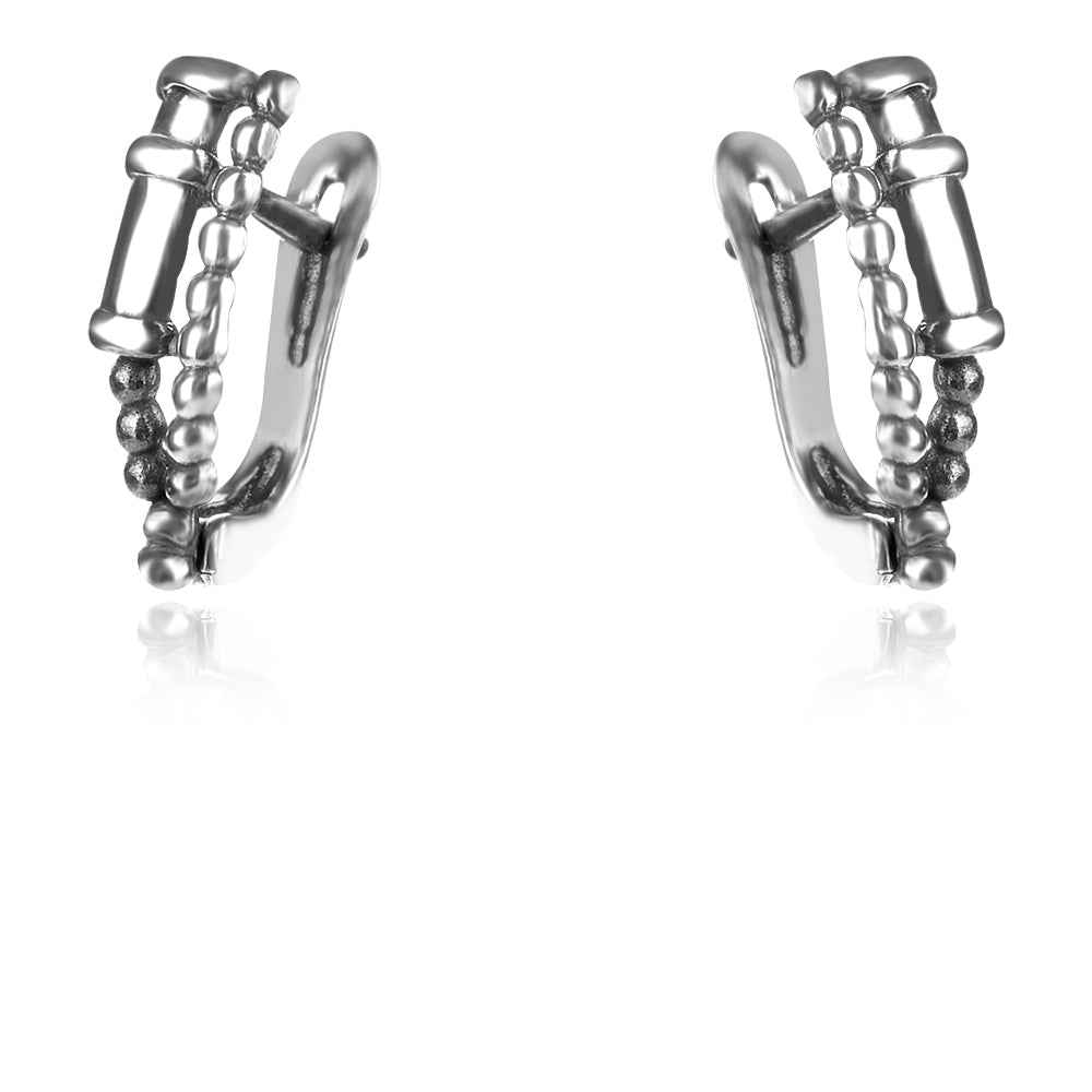 Сребърни обеци от българската ни колекция “Алгара”??. Обеците са с оксидация, която подчертава релефните декоративни елементи. Удобно английско закопчаване.