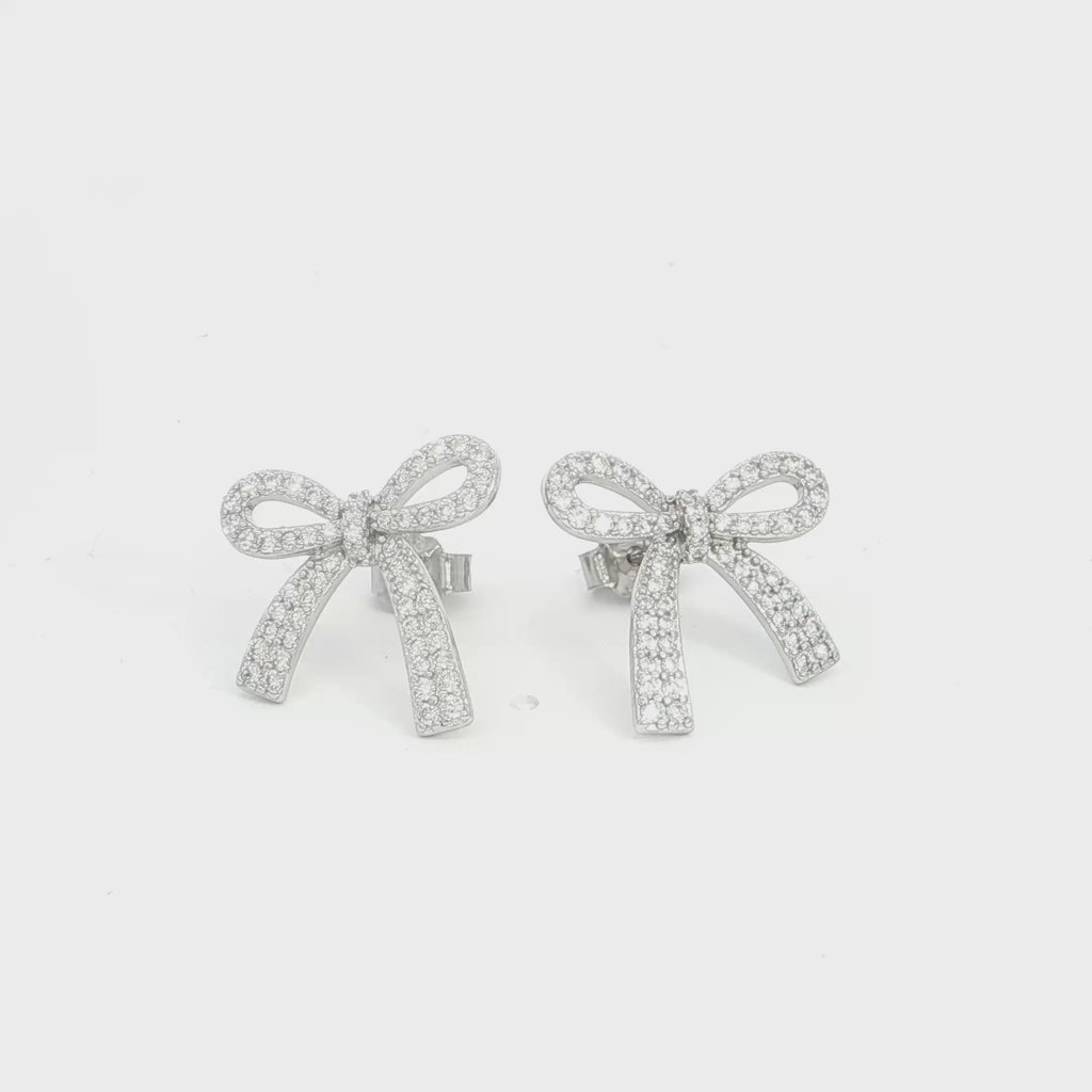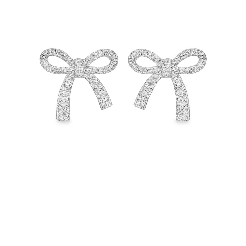 Сребърни обеци във форма на панделка с фино инкрустирани цирконии. Нежен и елегантен дизайн, подходящ за ежедневие и специални поводи.