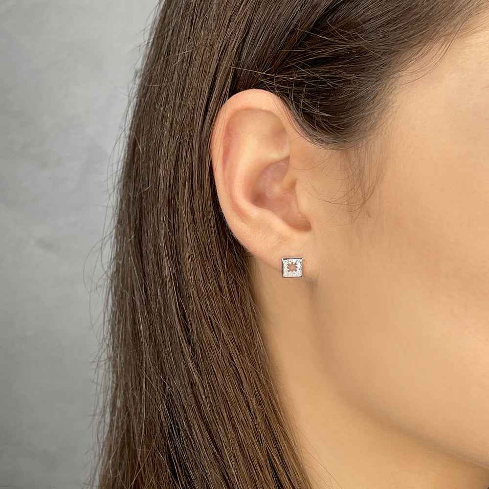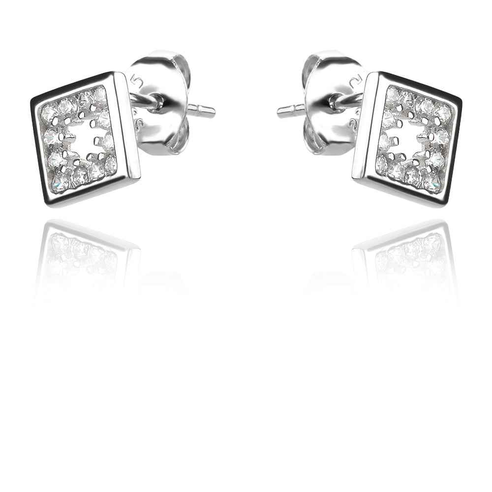 Нежни сребърни обеци с квадратна форма и интересна инкрустация на цирконии. Закопчаването е на щифт с винт. Родиевото покритие предпазва среброто от потъмняване и гарантира блясъка на бижуто.